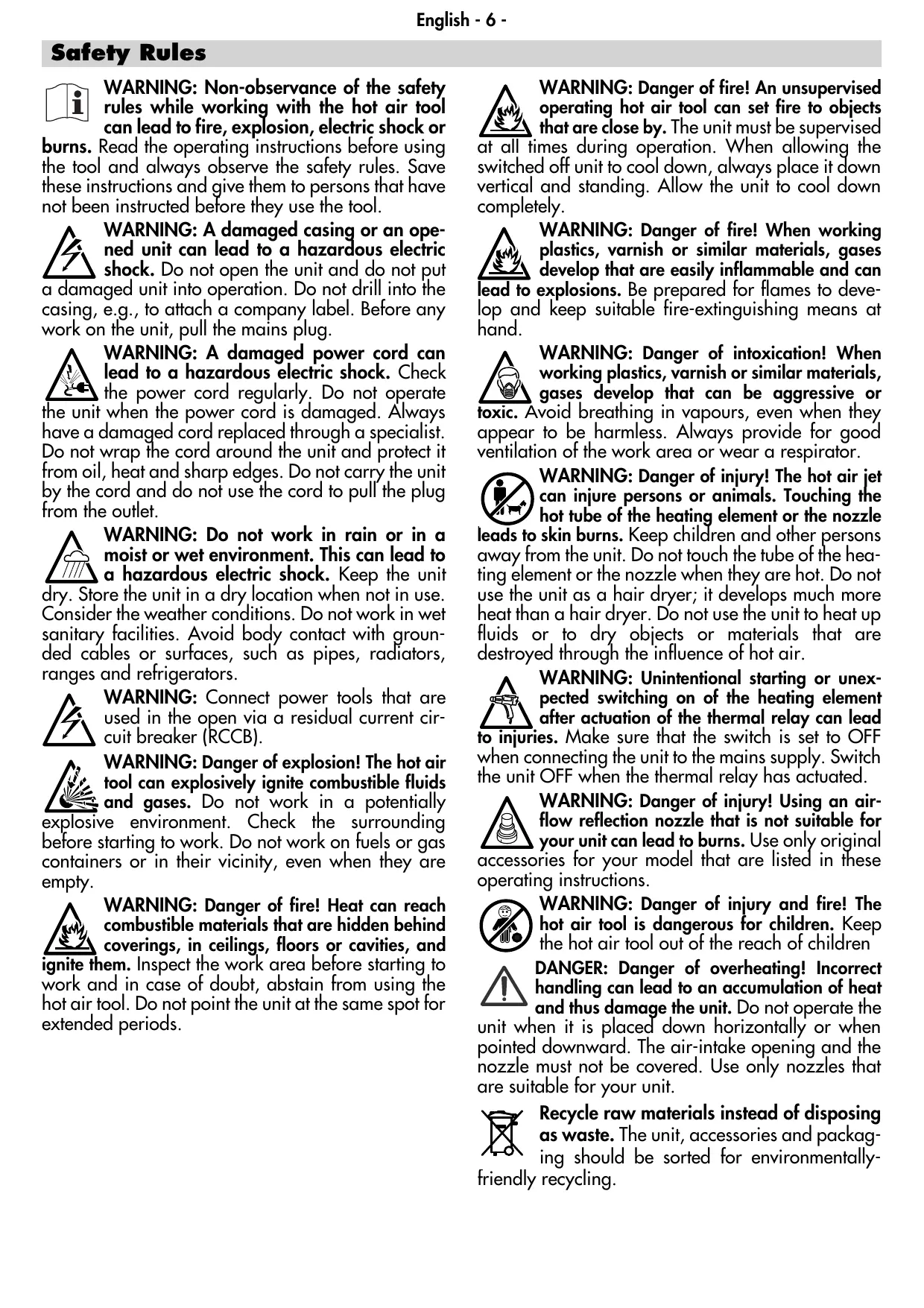 AVERTISSEMENT : Danger d’intoxication ! Le travail sur des matières plastiques, des vernis ou des matériaux similaires peut générer des gaz facilement inflammables qui peuvent être agressifs ou toxiques. Eviter d’inhaler des vapeurs même si celles-ci ne semblent pas présenter de danger. Toujours bien aérer la zone de travail ou porter un masque respiratoire. AVERTISSEMENT : Risques de blessures ! Le jet à air chaud peut blesser des personnes ou des animaux. Toucher le tuyau chaud de l’élément de chauffage ou de la buse entraîne des brûlures. Tenir les enfants et autres personnes à distance de l’appareil. Ne pas toucher le tuyau de l’élément de chauffage ni la buse quand ceux-ci sont chauds. Ne pas utiliser l’appareil comme sèche-cheveux, il devient beaucoup plus chaud qu’un sèche-cheveux. Ne pas utiliser l’appareil pour chauffer des liquides ou pour sécher des objets et des matériaux qui pourraient être détruits par les effets de l’air chaud. AVERTISSEMENT : Risques de blessures ! Un démarrage non-intentionné ou une mise en fonctionnement inattendue du chauffage après le déclenchement du thermorégulateur peut entraîner des blessures. S’assurer que l’interrupteur Marche/Arrêt est en position « Arrêt » quand l’appareil est raccordé au réseau électrique. Mettre l’appareil hors fonctionnement quand le thermorégulateur s’est déclenché. AVERTISSEMENT : Risques de blessures ! L’utilisation d’une buse avec une conduite d’arrivée d’air qui n’est pas appropriée à votre appareil, peut entraîner des brûlures. N’utiliser que des accessoires d’origine indiqués pour votre modèle dans la présente notice d’utilisation. AVERTISSEMENT : Risque de blessures et de brûlures ! L’appareil dans air chaud est dangereux pour les enfants. Garder l’appareil à air chaud dans un endroit inaccessible pour les enfants. ATTENTION : Danger de surchauffe ! Un mauvais maniement peut entraîner une accumulation de chaleur et endommager l’appareil. Ne pas utiliser l’appareil à plat ou toujours orienté vers le bas. L’orifice d’aspiration de l’air et la buse ne doivent pas être bouchés. N’utiliser que des buses conçues pour votre appareil. Récupération des matières premières plutôt qu’élimination des déchets. Les appareils, comme d’ailleurs leurs accessoires et emballages, doivent pouvoir suivre chacun une voie de recyclage approprié.