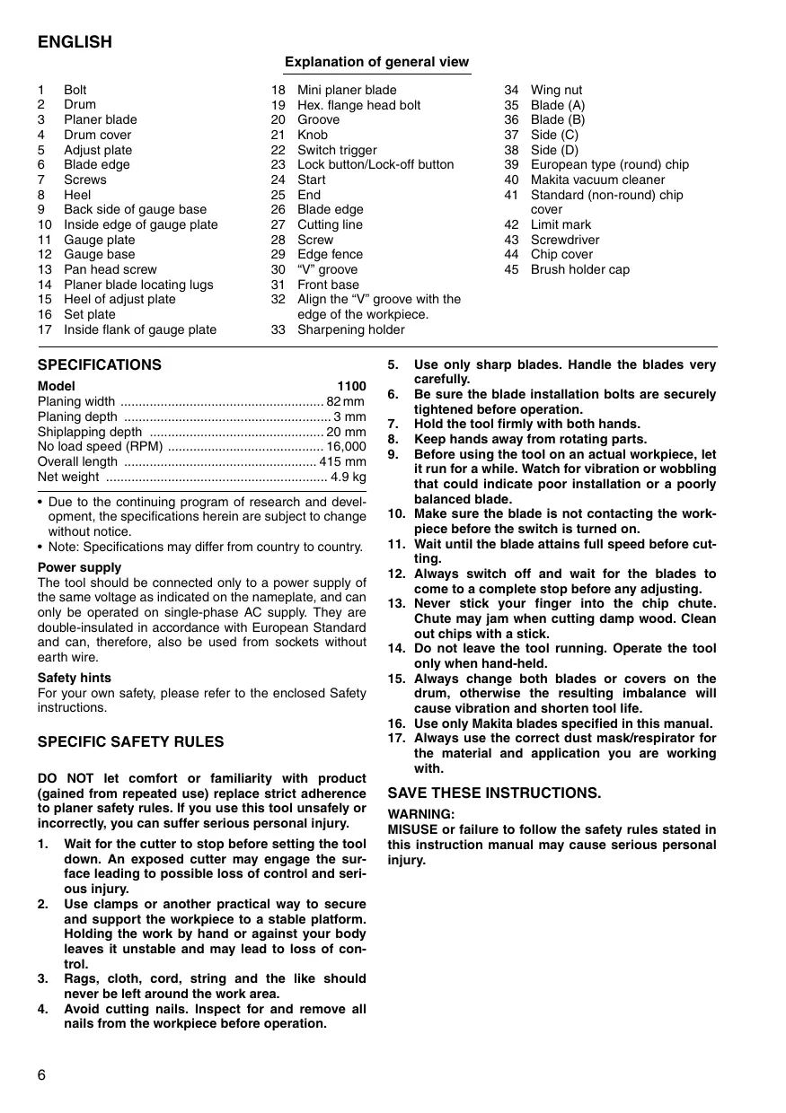 SPECIFICATIONS Model 1100 Planing width 82 mm Planing depth 3 mm Shiplapping depth 20 mm No load speed (RPM) 16,000 Overall length 415 mm Net weight 4.9 kg • Due to the continuing program of research and development, the specifications herein are subject to change without notice. • Note: Specifications may differ from country to country.