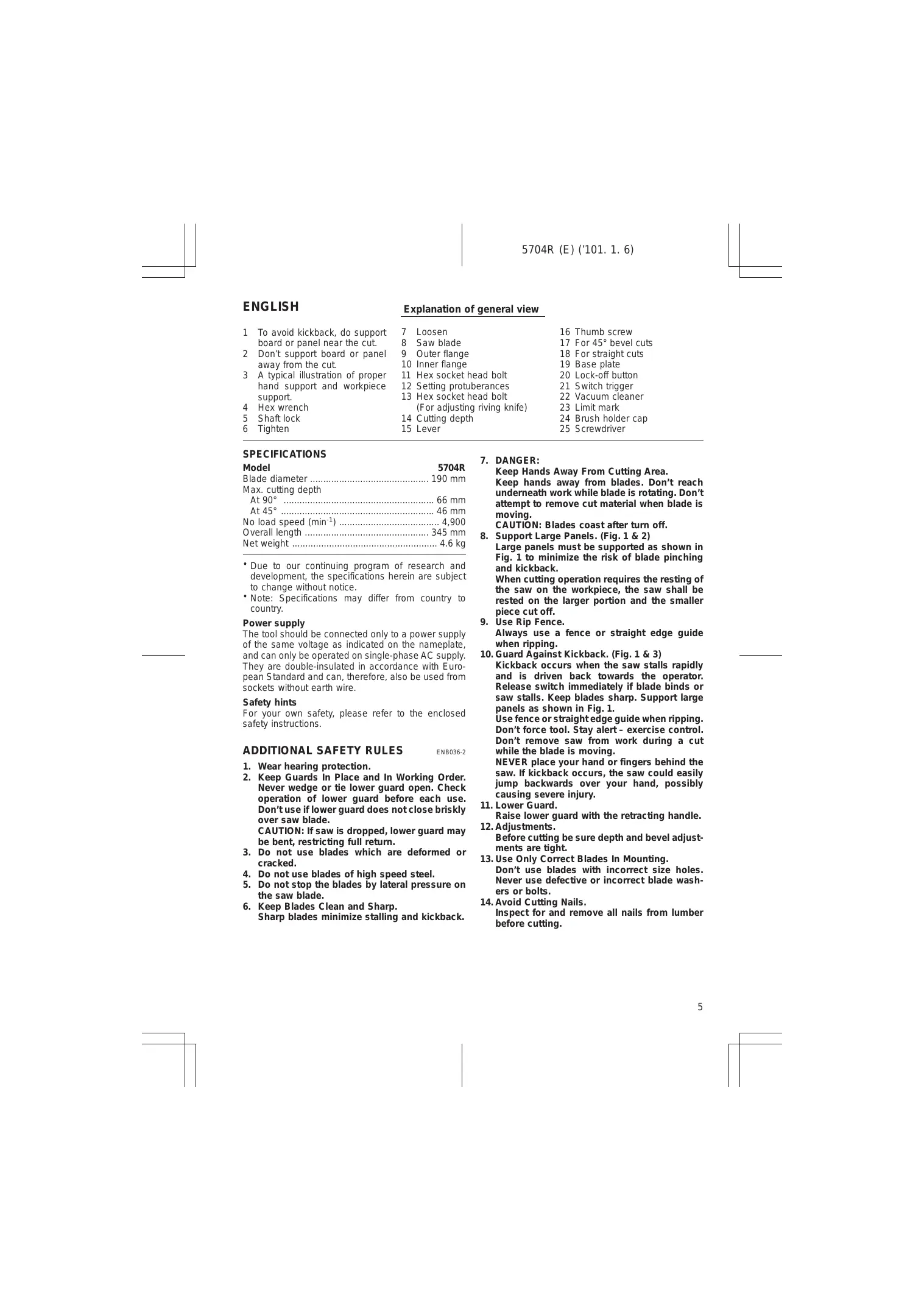ENGLISH 1 To avoid kickback, do support 7 Loosen board or panel near the cut. 8 Saw blade 2 Don't support board or panel away from the cut. 3 A typical illustration of proper hand support and workpiece 9 Outer flange 10 Inner flange 11 Hex socket head bolt 12 Setting protuberances 5704R (E) (‘101. 1. 6) Explanation of general view 16 Thumb screw 17 For 45° bevel cuts 18 For straight cuts 19 Base plate 20 Lock-off button 21 Switch trigger support 13 Hex socket head bolt 22 Vacuum cleaner 4 Hex wrench {For adjusting riving knife) 23 Limit mark 5 Shaftlock 14 Cutting depth 24 Brush holder cap 6 Tighten 15 Lever 25 Screwdriver SPECIFICATIONS 7. DANGER: Model Blade diameter … Max. cutting depth At 90° At 45° on on No load speed (min) Overall length .… Net weight ….