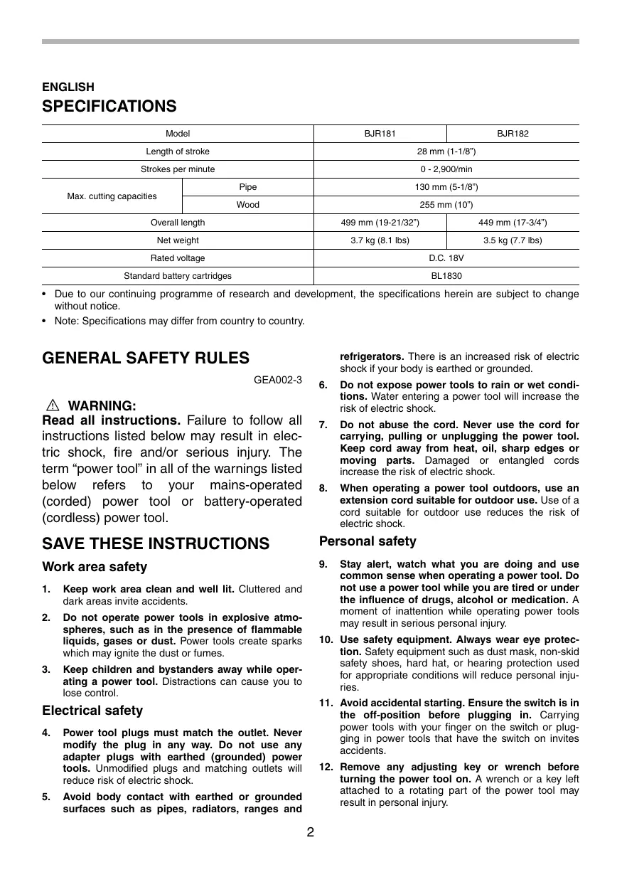 Download the instructions for your Scie sabre in PDF format for free! Find your manual BJR181 - MAKITA and take your electronic device back in hand. On this page are published all the documents necessary for the use of your device. BJR181 by MAKITA.
