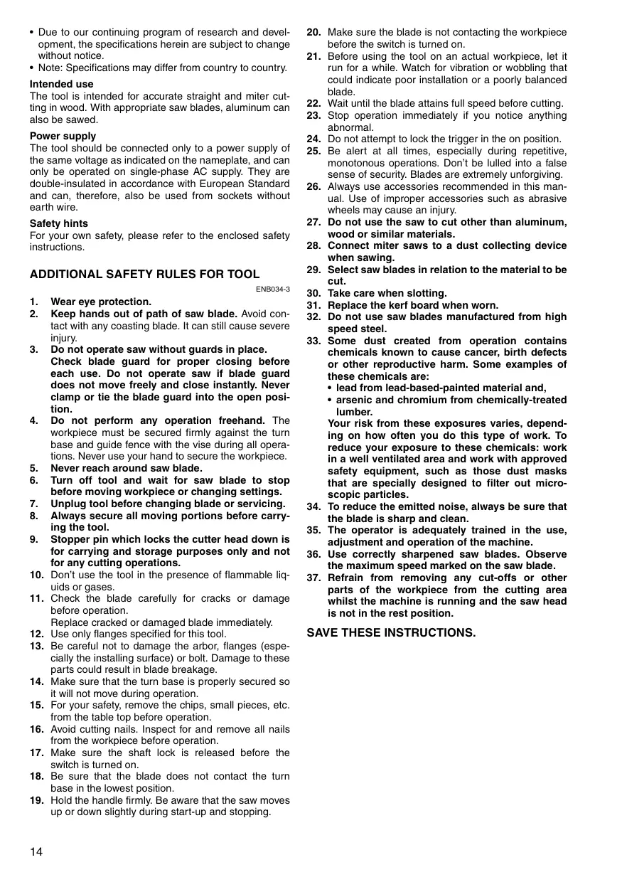 21. Before using the tool on an actual workpiece, let it run for a while. Watch for vibration or wobbling that could indicate poor installation or a poorly balanced blade. 22. Wait until the blade attains full speed before cutting. 23. Stop operation immediately if you notice anything abnormal. 24. Do not attempt to lock the trigger in the on position. 25. Be alert at all times, especially during repetitive, monotonous operations. Don’t be lulled into a false sense of security. Blades are extremely unforgiving. 26. Always use accessories recommended in this manual. Use of improper accessories such as abrasive wheels may cause an injury. 27. Do not use the saw to cut other than aluminum, wood or similar materials. 28. Connect miter saws to a dust collecting device when sawing. 29. Select saw blades in relation to the material to be cut. 30. Take care when slotting. 31. Replace the kerf board when worn. 32. Do not use saw blades manufactured from high speed steel. 33. Some dust created from operation contains chemicals known to cause cancer, birth defects or other reproductive harm. Some examples of these chemicals are: • lead from lead-based-painted material and, • arsenic and chromium from chemically-treated lumber. Your risk from these exposures varies, depending on how often you do this type of work. To reduce your exposure to these chemicals: work in a well ventilated area and work with approved safety equipment, such as those dust masks that are specially designed to filter out microscopic particles. 34. To reduce the emitted noise, always be sure that the blade is sharp and clean. 35. The operator is adequately trained in the use, adjustment and operation of the machine. 36. Use correctly sharpened saw blades. Observe the maximum speed marked on the saw blade. 37. Refrain from removing any cut-offs or other parts of the workpiece from the cutting area whilst the machine is running and the saw head is not in the rest position.