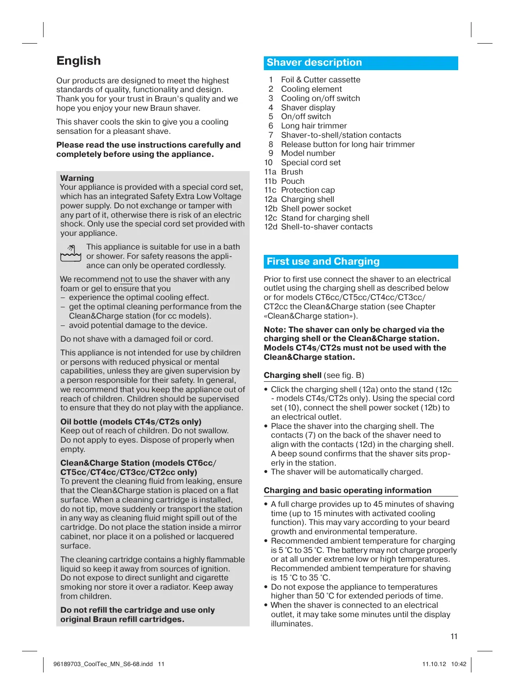 English Our products are designed to meet the highest standards of quality, functionality and design. Thank you for your trust in Braun’s quality and we hope you enjoy your new Braun shaver. This shaver cools the skin to give you a cooling sensation for a pleasant shave. Please read the use instructions carefully and completely before using the appliance. Warning Your appliance is provided with a special cord set, which has an integrated Safety Extra Low Voltage power supply. Do not exchange or tamper with any part of it, otherwise there is risk of an electric shock. Only use the special cord set provided with your appliance. This appliance is suitable for use in a bath or shower. For safety reasons the appliance can only be operated cordlessly. We recommend not to use the shaver with any foam or gel to ensure that you – experience the optimal cooling effect. – get the optimal cleaning performance from the Clean&Charge station (for cc models). – avoid potential damage to the device. Do not shave with a damaged foil or cord. This appliance is not intended for use by children or persons with reduced physical or mental capabilities, unless they are given supervision by a person responsible for their safety. In general, we recommend that you keep the appliance out of reach of children. Children should be supervised to ensure that they do not play with the appliance. Oil bottle (models CT4s/CT2s only) Keep out of reach of children. Do not swallow. Do not apply to eyes. Dispose of properly when empty. Clean&Charge Station (models CT6cc/ CT5cc/CT4cc/CT3cc/CT2cc only) To prevent the cleaning fluid from leaking, ensure that the Clean&Charge station is placed on a flat surface. When a cleaning cartridge is installed, do not tip, move suddenly or transport the station in any way as cleaning fluid might spill out of the cartridge. Do not place the station inside a mirror cabinet, nor place it on a polished or lacquered surface. The cleaning cartridge contains a highly flammable liquid so keep it away from sources of ignition. Do not expose to direct sunlight and cigarette smoking nor store it over a radiator. Keep away from children. Do not refill the cartridge and use only original Braun refill cartridges. Foil & Cutter cassette Cooling element Cooling on/off switch Shaver display On/off switch Long hair trimmer Shaver-to-shell/station contacts Release button for long hair trimmer Model number Special cord set Brush Pouch Protection cap Charging shell Shell power socket Stand for charging shell Shell-to-shaver contacts First use and Charging Prior to first use connect the shaver to an electrical outlet using the charging shell as described below or for models CT6cc/CT5cc/CT4cc/CT3cc/ CT2cc the Clean&Charge station (see Chapter «Clean&Charge station»). Note: The shaver can only be charged via the charging shell or the Clean&Charge station. Models CT4s/CT2s must not be used with the Clean&Charge station. Charging shell (see fig. B)