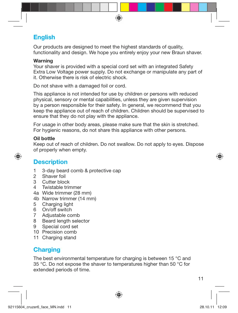 Stapled booklet, 105x148 mm, 80 p (incl. 8 p cover), 2/2c = black + cyan cruZer Type 5730 www.braun.com 852-25249377 (Audio Supplies Company Ltd.) www.service.braun.com English Our products are designed to meet the highest standards of quality, functionality and design. We hope you entirely enjoy your new Braun shaver. Warning Your shaver is provided with a special cord set with an integrated Safety Extra Low Voltage power supply. Do not exchange or manipulate any part of it. Otherwise there is risk of electric shock. Do not shave with a damaged foil or cord. This appliance is not intended for use by children or persons with reduced physical, sensory or mental capabilities, unless they are given supervision by a person responsible for their safety. In general, we recommend that you keep the appliance out of reach of children. Children should be supervised to ensure that they do not play with the appliance. For usage in other body areas, please make sure that the skin is stretched. For hygienic reasons, do not share this appliance with other persons. Oil bottle Keep out of reach of children. Do not swallow. Do not apply to eyes. Dispose of properly when empty. Description