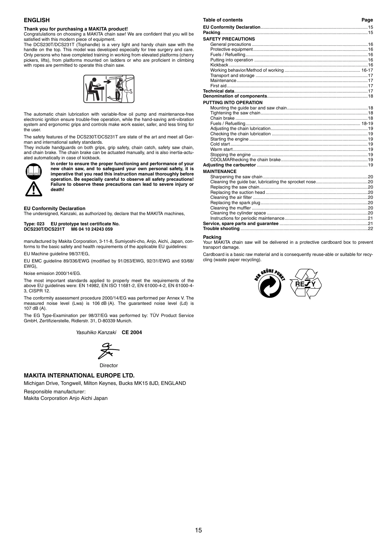 waste oil Gasoline OIL Table of contents Thank you for purchasing a MAKITA product! Congratulations on choosing a MAKITA chain saw! We are confident that you will be satisfied with this modern piece of equipment. The DCS230T/DCS231T (Tophandle) is a very light and handy chain saw with the handle on the top. This model was developed especially for tree surgery and care. Only persons who have completed training in working from elevated platforms (cherry pickers, lifts), from platforms mounted on ladders or who are proficient in climbing with ropes are permitted to operate this chain saw. The automatic chain lubrication with variable-flow oil pump and maintenance-free electronic ignition ensure trouble-free operation, while the hand-saving anti-vibration system and ergonomic grips and controls make work easier, safer, and less tiring for the user. The safety features of the DCS230T/DCS231T are state of the art and meet all German and international safety standards. They include handguards on both grips, grip safety, chain catch, safety saw chain, and chain brake. The chain brake can be actuated manually, and is also inertia-actuated automatically in case of kickback. In order to ensure the proper functioning and performance of your new chain saw, and to safeguard your own personal safety, it is imperative that you read this instruction manual thoroughly before operation. Be especially careful to observe all safety precautions! Failure to observe these precautions can lead to severe injury or death! EU Conformity Declaration The undersigned, Kanzaki, as authorized by, declare that the MAKITA machines, Type: 023 EU prototype test certificate No.