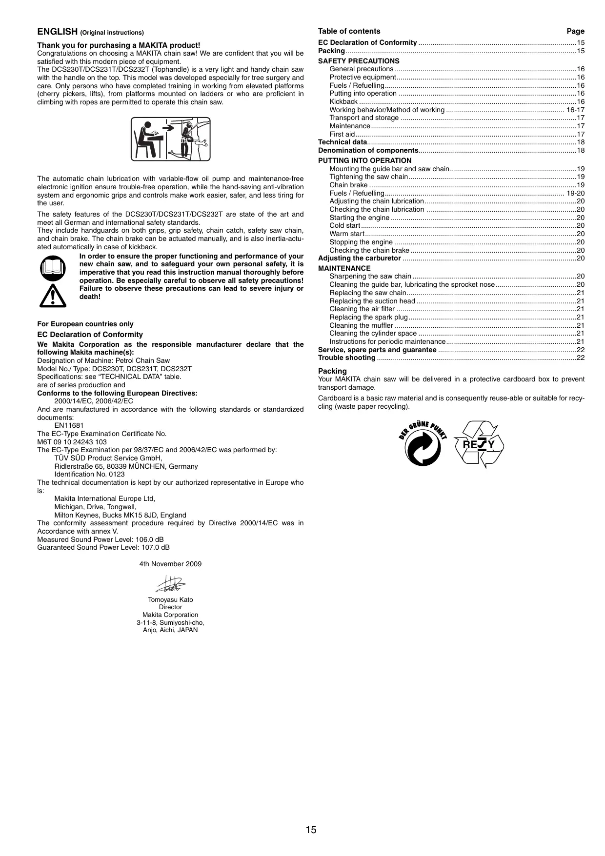 waste oil Gasoline OIL ENGLISH (Original instructions) Table of contents Thank you for purchasing a MAKITA product! Congratulations on choosing a MAKITA chain saw! We are confident that you will be satisfied with this modern piece of equipment. The DCS230T/DCS231T/DCS232T (Tophandle) is a very light and handy chain saw with the handle on the top. This model was developed especially for tree surgery and care. Only persons who have completed training in working from elevated platforms (cherry pickers, lifts), from platforms mounted on ladders or who are proficient in climbing with ropes are permitted to operate this chain saw. The automatic chain lubrication with variable-flow oil pump and maintenance-free electronic ignition ensure trouble-free operation, while the hand-saving anti-vibration system and ergonomic grips and controls make work easier, safer, and less tiring for the user. The safety features of the DCS230T/DCS231T/DCS232T are state of the art and meet all German and international safety standards. They include handguards on both grips, grip safety, chain catch, safety saw chain, and chain brake. The chain brake can be actuated manually, and is also inertia-actuated automatically in case of kickback. In order to ensure the proper functioning and performance of your new chain saw, and to safeguard your own personal safety, it is imperative that you read this instruction manual thoroughly before operation. Be especially careful to observe all safety precautions! Failure to observe these precautions can lead to severe injury or death! For European countries only EC Declaration of Conformity We Makita Corporation as the responsible manufacturer declare that the following Makita machine(s): Designation of Machine: Petrol Chain Saw Model No./ Type: DCS230T, DCS231T, DCS232T Specifications: see “TECHNICAL DATA” table. are of series production and Conforms to the following European Directives: 2000/14/EC, 2006/42/EC And are manufactured in accordance with the following standards or standardized documents: EN11681 The EC-Type Examination Certificate No. M6T 09 10 24243 103 The EC-Type Examination per 98/37/EC and 2006/42/EC was performed by: TÜV SÜD Product Service GmbH, Ridlerstraße 65, 80339 MÜNCHEN, Germany Identification No. 0123 The technical documentation is kept by our authorized representative in Europe who is: Makita International Europe Ltd, Michigan, Drive, Tongwell, Milton Keynes, Bucks MK15 8JD, England The conformity assessment procedure required by Directive 2000/14/EC was in Accordance with annex V. Measured Sound Power Level: 106.0 dB Guaranteed Sound Power Level: 107.0 dB Page Packing Your MAKITA chain saw will be delivered in a protective cardboard box to prevent transport damage. Cardboard is a basic raw material and is consequently reuse-able or suitable for recycling (waste paper recycling). RE Y 4th November 2009 Tomoyasu Kato Director Makita Corporation 3-11-8, Sumiyoshi-cho, Anjo, Aichi, JAPAN