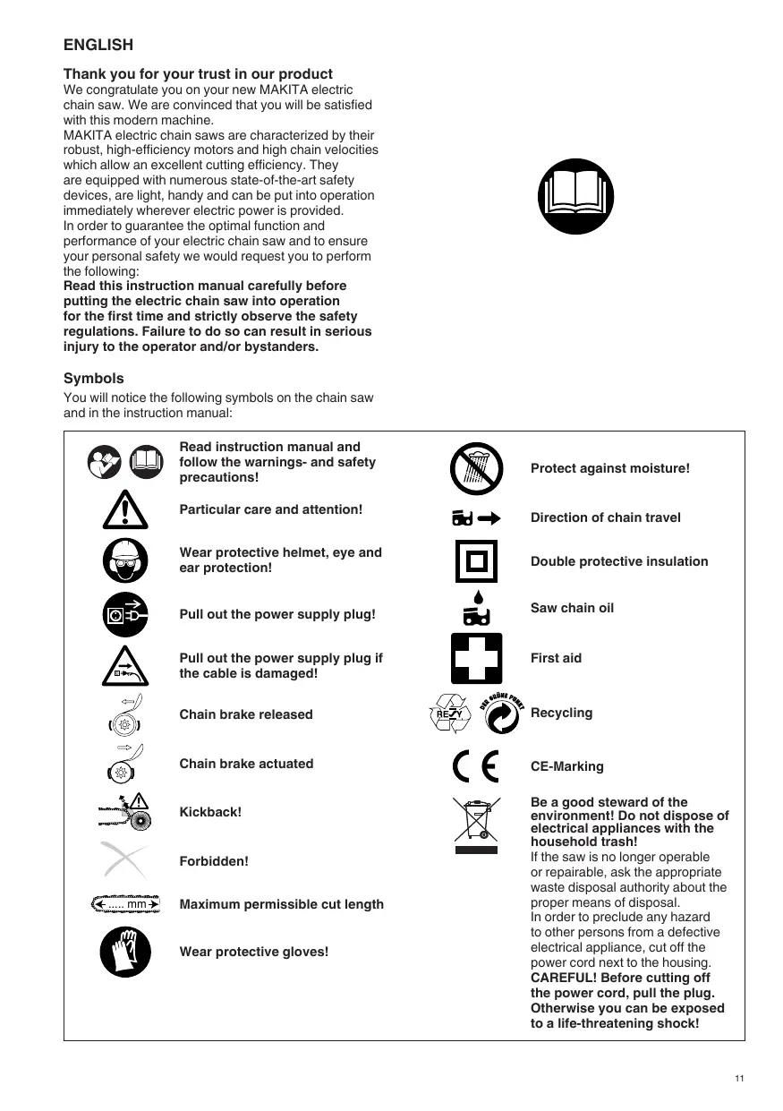Download the instructions for your Tronçonneuse électrique in PDF format for free! Find your manual UC3530A - MAKITA and take your electronic device back in hand. On this page are published all the documents necessary for the use of your device. UC3530A by MAKITA.