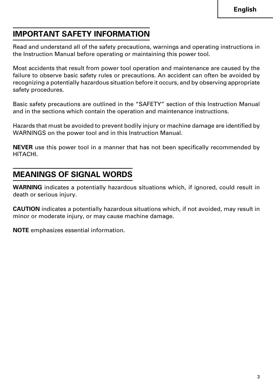 Read and understand all of the safety precautions, warnings and operating instructions in the Instruction Manual before operating or maintaining this power tool. Most accidents that result from power tool operation and maintenance are caused by the failure to observe basic safety rules or precautions. An accident can often be avoided by recognizing a potentially hazardous situation before it occurs, and by observing appropriate safety procedures. Basic safety precautions are outlined in the “SAFETY” section of this Instruction Manual and in the sections which contain the operation and maintenance instructions. Hazards that must be avoided to prevent bodily injury or machine damage are identified by WARNINGS on the power tool and in this Instruction Manual. NEVER use this power tool in a manner that has not been specifically recommended by HITACHI.