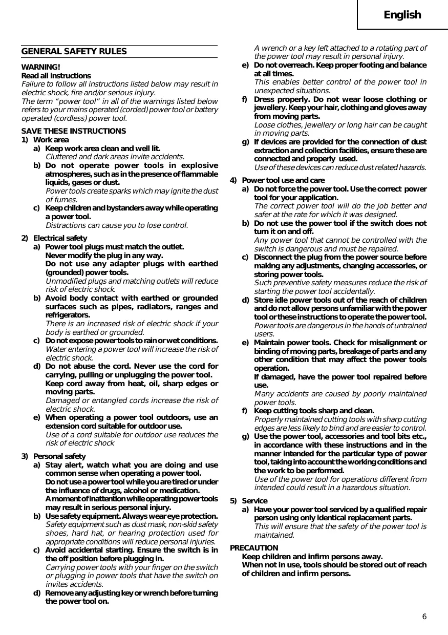 a) Do not force the power tool. Use the correct power tool for your application. The correct power tool will do the job better and safer at the rate for which it was designed. b) Do not use the power tool if the switch does not turn it on and off. Any power tool that cannot be controlled with the switch is dangerous and must be repaired. c) Disconnect the plug from the power source before making any adjustments, changing accessories, or storing power tools. Such preventive safety measures reduce the risk of starting the power tool accidentally. d) Store idle power tools out of the reach of children and do not allow persons unfamiliar with the power tool or these instructions to operate the power tool. Power tools are dangerous in the hands of untrained users. e) Maintain power tools. Check for misalignment or binding of moving parts, breakage of parts and any other condition that may affect the power tools operation. If damaged, have the power tool repaired before use. Many accidents are caused by poorly maintained power tools. f) Keep cutting tools sharp and clean. Properly maintained cutting tools with sharp cutting edges are less likely to bind and are easier to control. g) Use the power tool, accessories and tool bits etc., in accordance with these instructions and in the manner intended for the particular type of power tool, taking into account the working conditions and the work to be performed. Use of the power tool for operations different from intended could result in a hazardous situation.