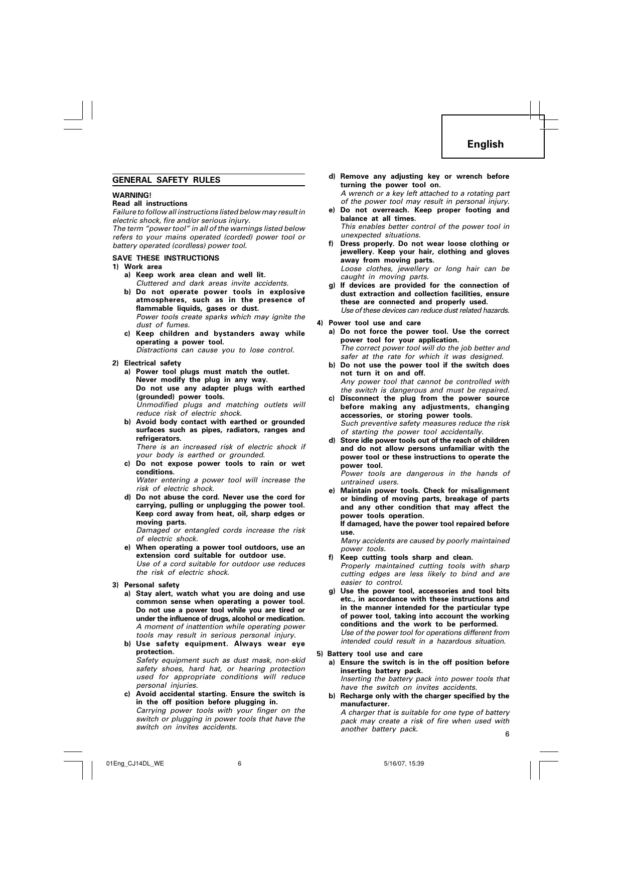 5/16/07, 15:39 English c) Use power tools only with specifically designated battery packs. Use of any other battery packs may create a risk of injury and fire. d) When battery pack is not in use, keep it away from other metal objects like paper clips, coins, keys, nails, screws, or other small metal objects that can make a connection from one terminal to another. Shorting the battery terminals together may cause burns or a fire. e) Under abusive conditions, liquid may be ejected from the battery; avoid contact. If contact accidentally occurs, flush with water. If liquid contacts eyes, additionally seek medical help. Liquid ejected from the battery may cause irritation or burns.