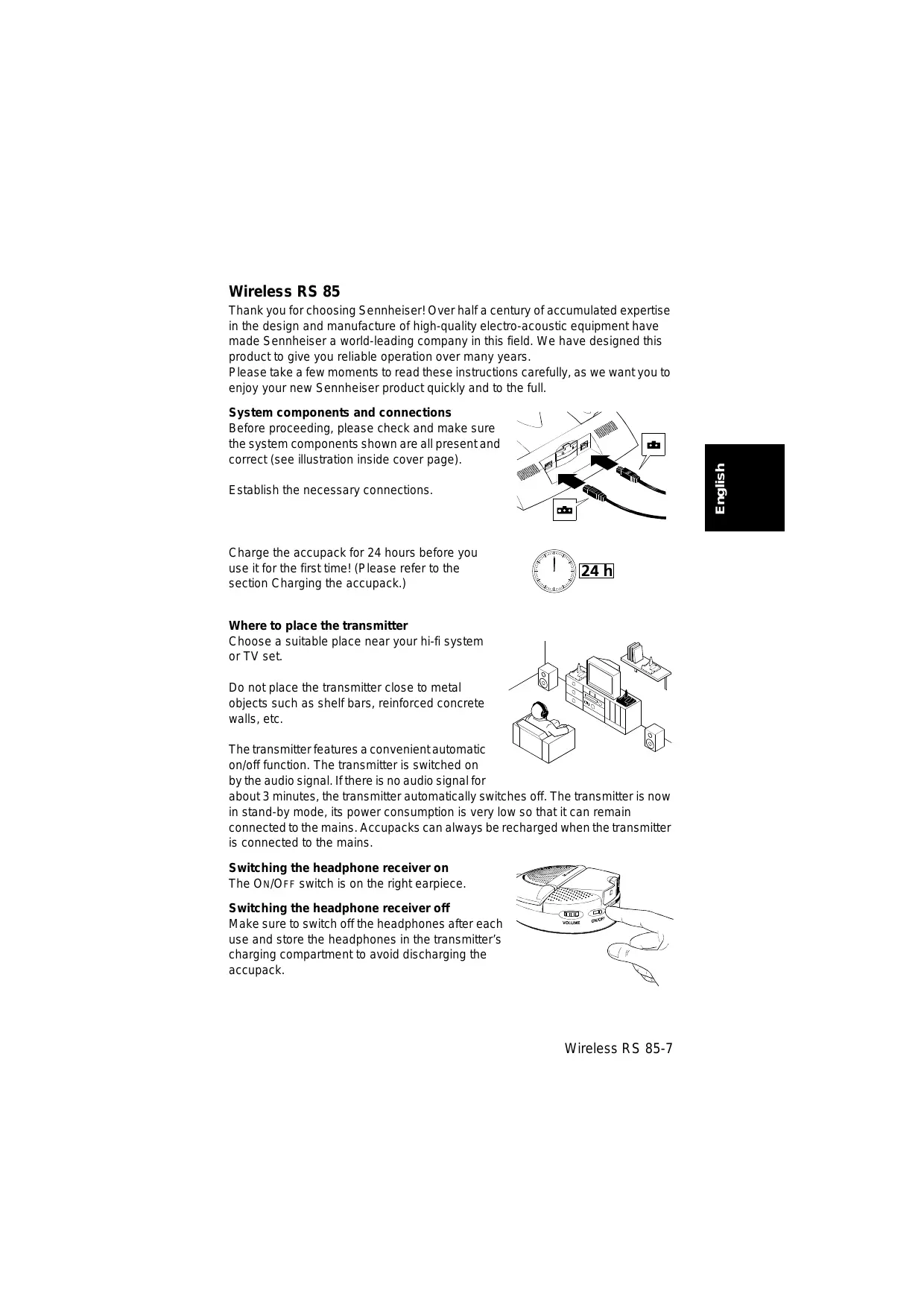 Wireless RS 85 Thank you for choosing Sennheiser! Over half a century of accumulated expertise in the design and manufacture of high-quality electro-acoustic equipment have made Sennheiser a worid-leading company in this field. We have designed this product to give you reliable operation over many years Please take a few moments to read these instructions carefully, as we want you to enjoy your new Sennheiser product quickly and to the full. System components and connections Before proceeding, please check and make sure the system components shown are all presentand correct (see illustration inside cover page). Establish the necessary connections. Charge the accupack for 24 hours before you use it for the first time! (Please refer to the section Charging the accupack.) Where to place the transmitter Choose a suitable place near your hi-fi system orTV set. Do not place the transmitter close to metal objects such as shelf bars, reinforced concrete walls, etc. The transmitter features a convenientautomatic on/off function. The transmitter is switched on by the audio signal. Ifthere is no audio signal for about 3 minutes, the transmitter automatically switches off. The transmitter is now in stand-by mode, its power consumption is very low 50 that it can remain connected to the mains. Accupacks can always be recharged when the transmitter is connected to the mains Switching the headphone receiver on The ON/OrF switch is on the right earpiece. Switching the headphone receiver off Make sure to switch offthe headphones after each use and store the headphones in the transmitters charging compartment to avoid discharging the accupack. Wireless RS 85-7