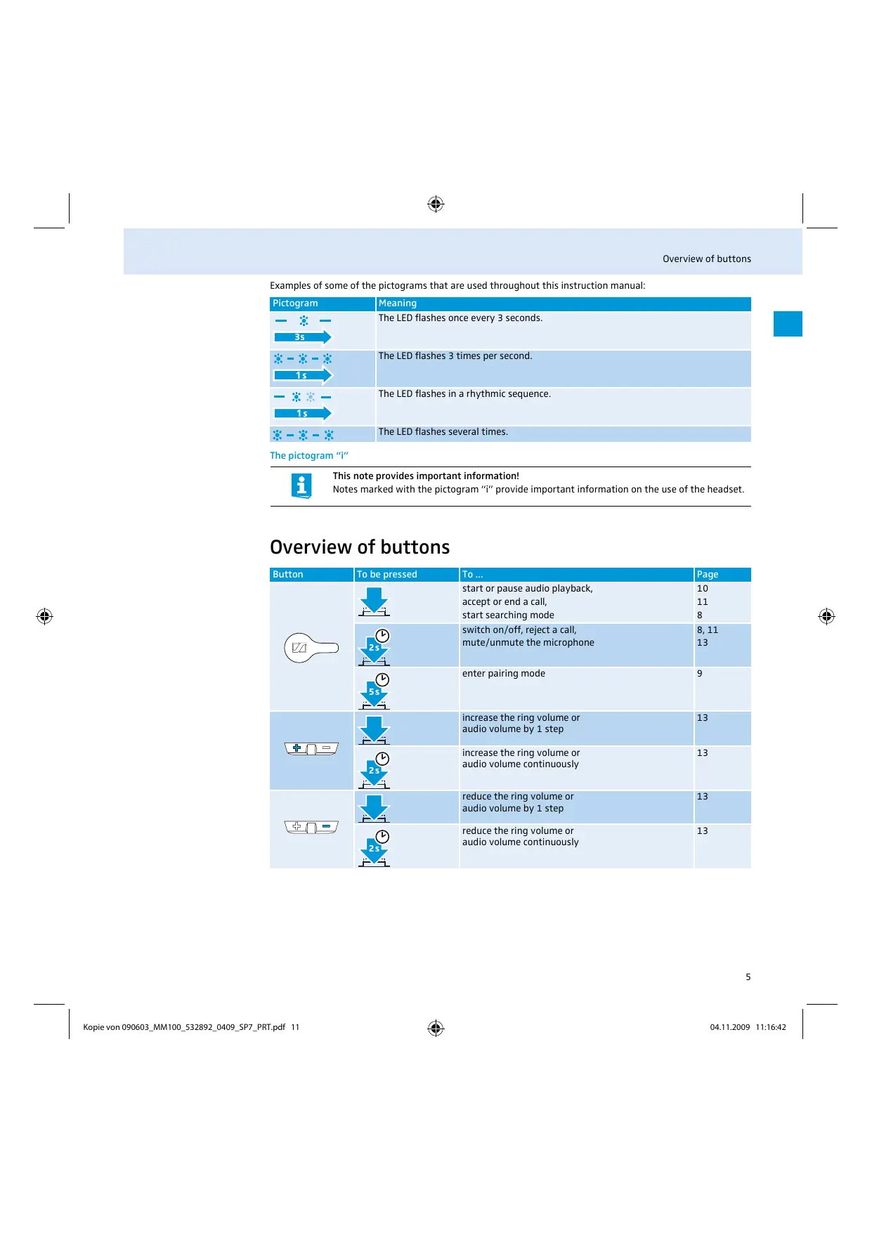 The LED flashes 3 times per second. The LED flashes in a rhythmic sequence. The LED flashes several times. The pictogram “i” This note provides important information! Notes marked with the pictogram “i” provide important information on the use of the headset. Overview of buttons Button To be pressed