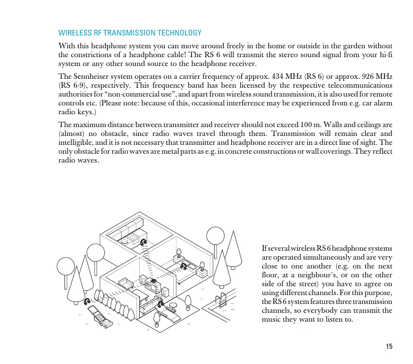 With this headphone system you can move around freely in the home or outside in the garden without the constrictions of a headphone cable! The RS 6 will transmit the stereo sound signal from your hi-fi system or any other sound source to the headphone receiver. The Sennheiser system operates on a carrier frequency of approx. 434 MHz (RS 6) or approx. 926 MHz (RS 6-9), respectively. This frequency band has been licensed by the respective telecommunications authorities for “non-commercial use”, and apart from wireless sound transmission, it is also used for remote controls etc. (Please note: because of this, occasional interference may be experienced from e.g. car alarm radio keys.) The maximum distance between transmitter and receiver should not exceed 100 m. Walls and ceilings are (almost) no obstacle, since radio waves travel through them. Transmission will remain clear and intelligible, and it is not necessary that transmitter and headphone receiver are in a direct line of sight. The only obstacle for radio waves are metal parts as e.g. in concrete constructions or wall coverings. They reflect radio waves. If several wireless RS 6 headphone systems are operated simultaneously and are very close to one another (e.g. on the next floor, at a neighbour´s, or on the other side of the street) you have to agree on using different channels. For this purpose, the RS 6 system features three transmission channels, so everybody can transmit the music they want to listen to.