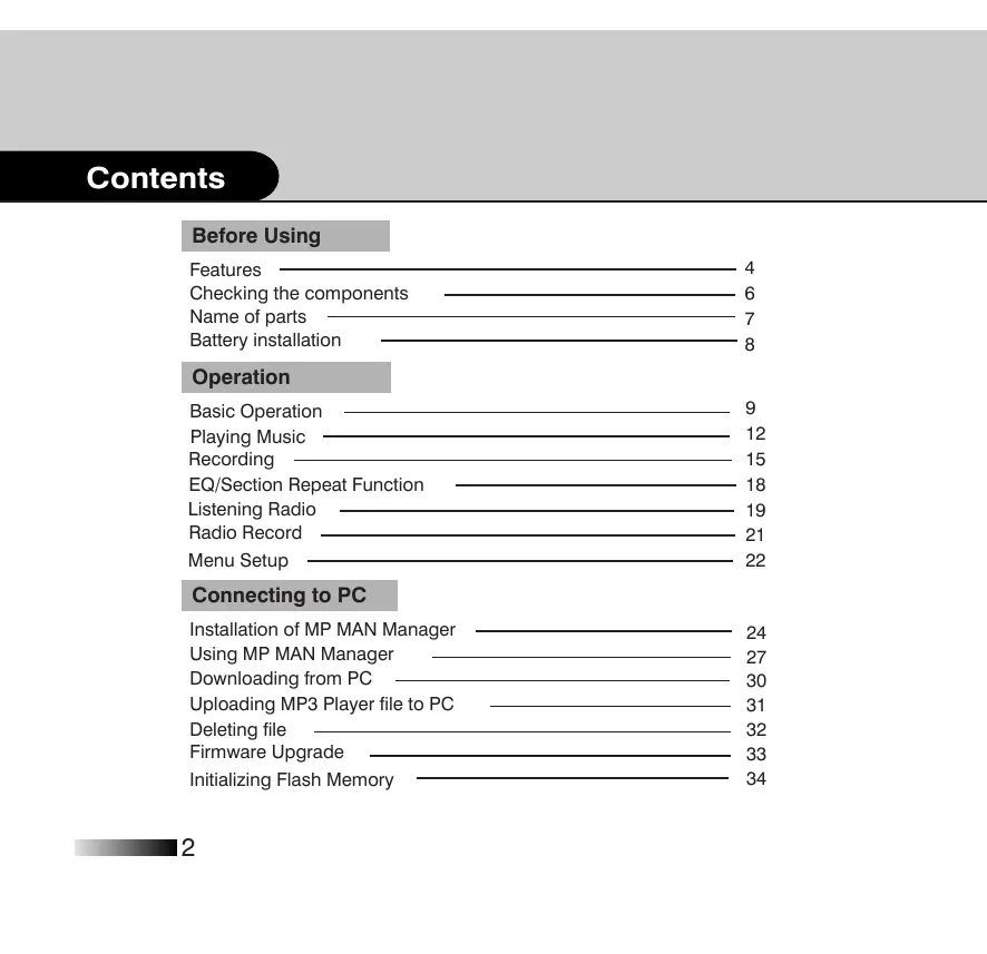 Before Using Features Checking the components Name of parts Battery installation Operation Basic Operation Playing Music Recording EQ/Section Repeat Function Listening Radio Radio Record Menu Setup Connecting to PC Installation of MP MAN Manager Using MP MAN Manager Downloading from PC Uploading MP3 Player file to PC Deleting file Firmware Upgrade Initializing Flash Memory D © oo»