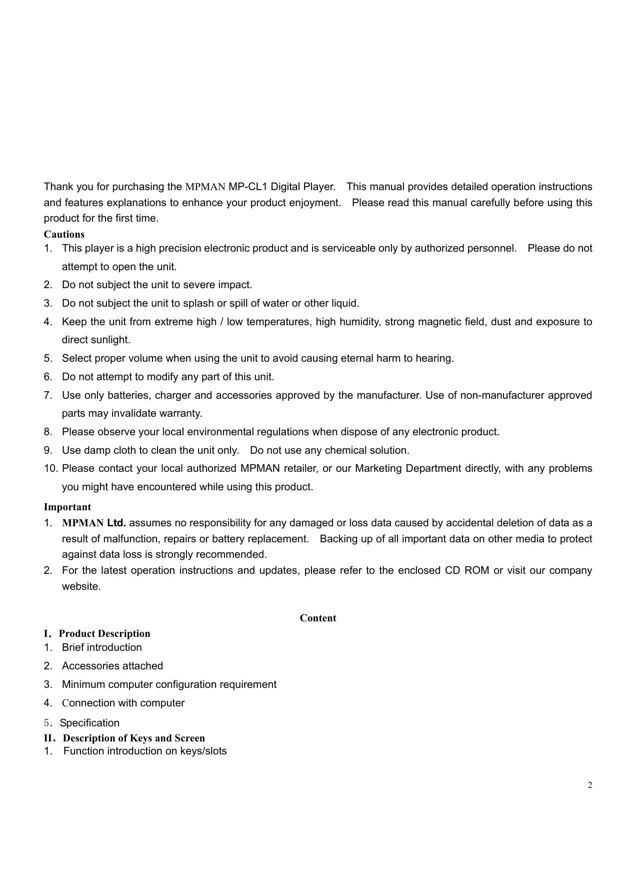Thank you for purchasing the MPMAN MP-CL1 Digital Player. This manual provides detailed operation instructions and features explanations to enhance your product enjoyment. Please read this manual carefully before using this product for the first time. Cautions