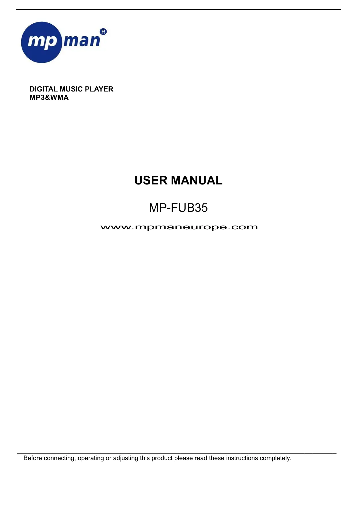 MP3&WMA USER MANUAL MP-FUB35 WWW-mpmaneurope.com Before connecting, operating or adjusting this product please read these instructions completely.