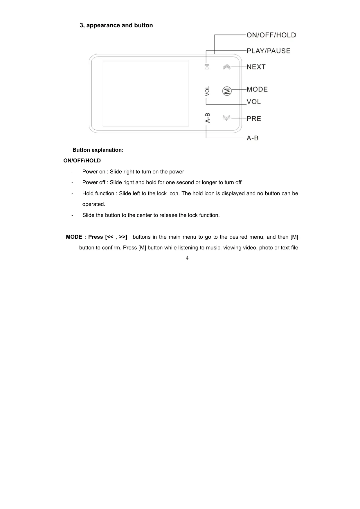 - Power on: Slide right to turn on the power - Power off: Slide right and hold for one second or longer to turn off - Hold function : Slide left to the lock icon. The hold icon is displayed and no button can be operated. - Slide the button to the center to release the lock function. MODE : Press [<< , >>] buttons in the main menu to go to the desired menu, and then [M] button to confirm. Press [M] button while listening to music, viewing video, photo or text file