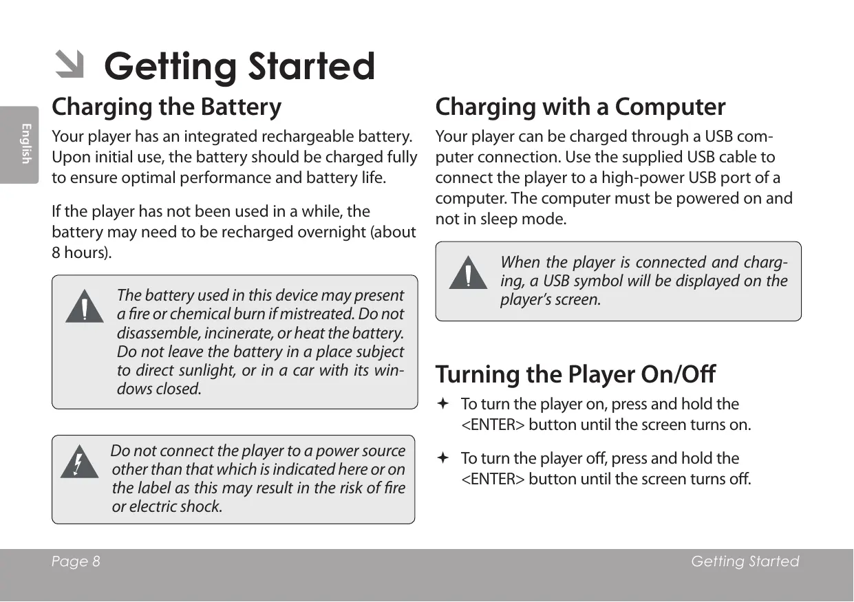 SN Getting Started Charging the Battery Your player has an integrated rechargeable battery. Upon initial use, the battery should be charged fully to ensure optimal performance and battery life. Ifthe player has not been used in a while, the battery may need to be recharged overnight (about 8 hours). The battery used in this device may present a fire or chemical burn if mistreated. Do not disassemble, incinerate, or heat the battery. Do not leave the battery in a place subject to direct sunlight, or in a car with its win- dows closed. Do not connect the player to a power source other than that which is indicated here or on the label as this may result in the risk of fire or electric shock.