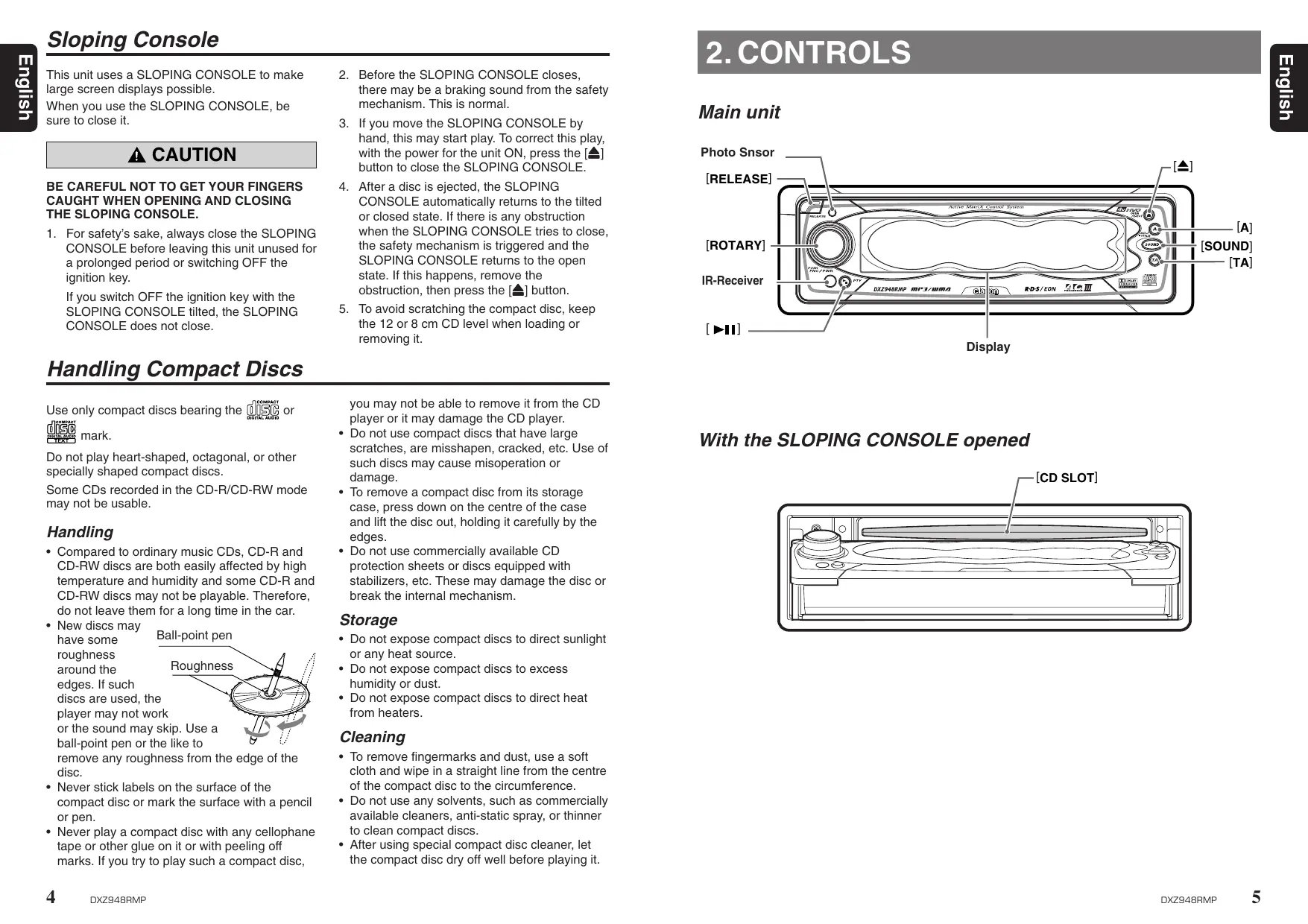 PRECAUTIONS Sloping Console Handling Compact Discs CONTROLS … NOMENCLATURE Names of the Buttons and their Functions Major Button Operations when External Equipment is Connected to this Unit Display Items . Display Operations DCP … REMOTE CONTROL Inserting the Batteries Functions of Remote OPERATIONS Basic Operations AC-Processor III Operations Radio Operations RDS Operations