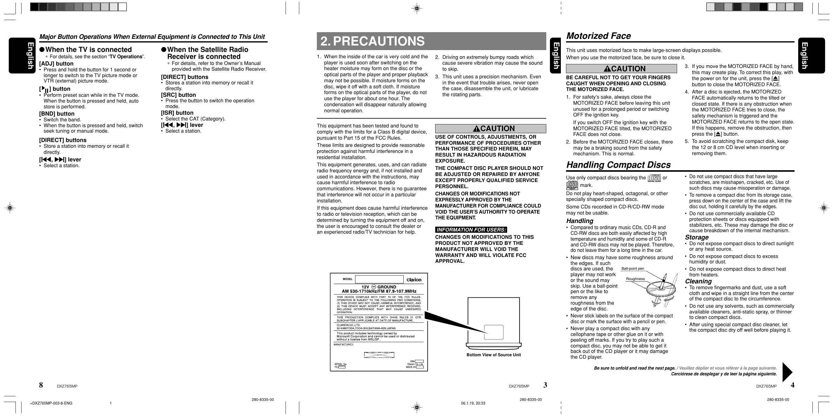 ”] | +DXZ765MP-001-cover 2 280-8335-00 Thank you for purchasing this Clarion product. + Please read this owner's manual in its entirety before operating this equipment. + After reading this manual, be sure to keep it in a handy place (e.g., glove compartment). + Check the contents of the enclosed warranty card and keep it carefully with this manual. + This manual includes the operating procedures of the iPod interface, CD changer, Satellite Radio Receiver and TV tuner connected via the CeNET cable. The iPod interface, CD changer and TV tuner have their own manuals, but no explanations for operating them are described. Contents