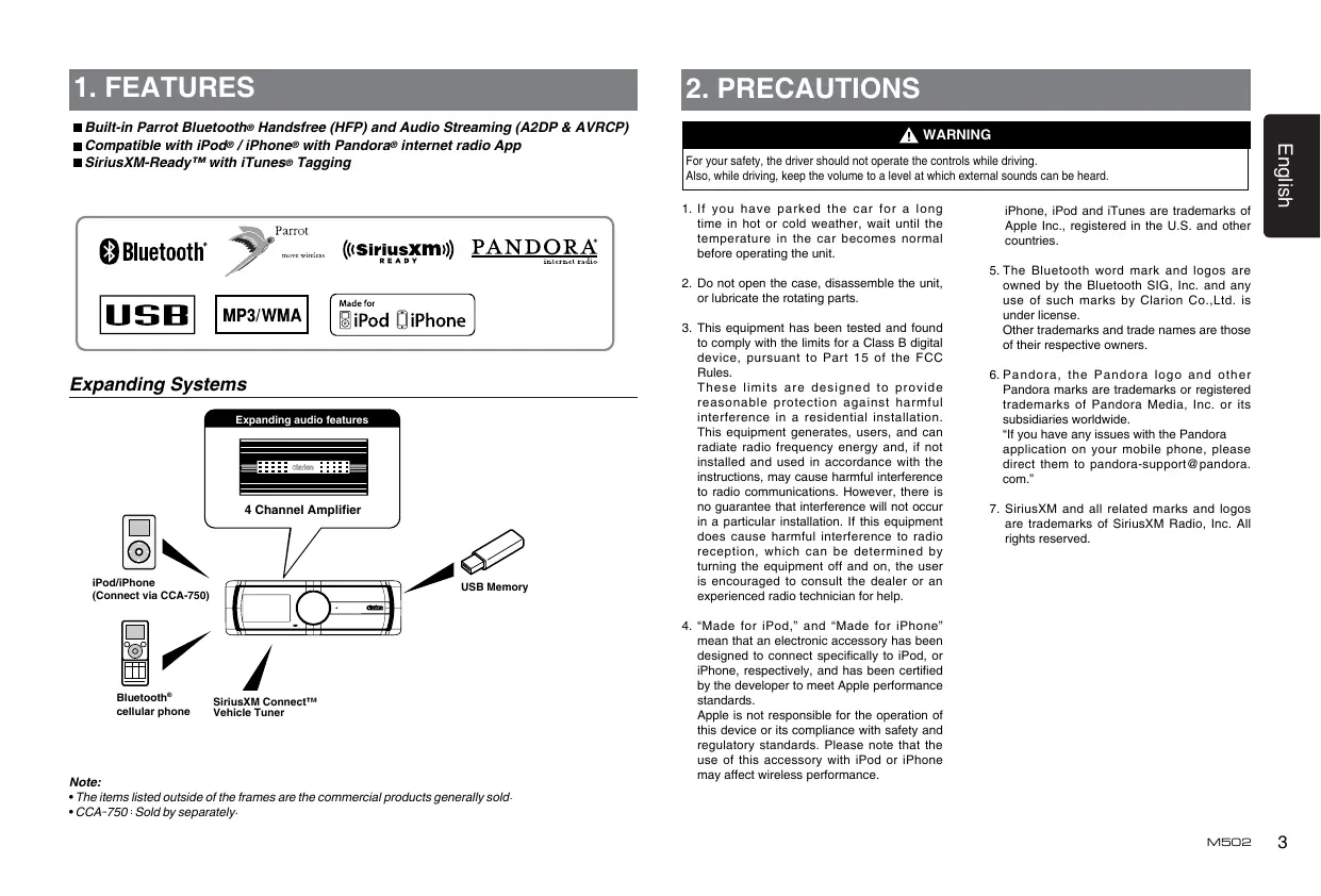 Apple Inc., registered in the U.S. and other countries. 5. T he Bluetooth word mark and logos are owned by the Bluetooth SIG, Inc. and any use of such marks by Clarion Co.,Ltd. is under license. Other trademarks and trade names are those of their respective owners. 6. P andora, the Pandora logo and other Pandora marks are trademarks or registered trademarks of Pandora Media,Inc. or its subsidiaries worldwide. “If you have any issues with the Pandora application on your mobile phone,please direct them to pandora-support@pandora. com.” 7. SiriusXM and all related marks and logos are trademarks of Sirius XM Radio, Inc. All rights reserved.