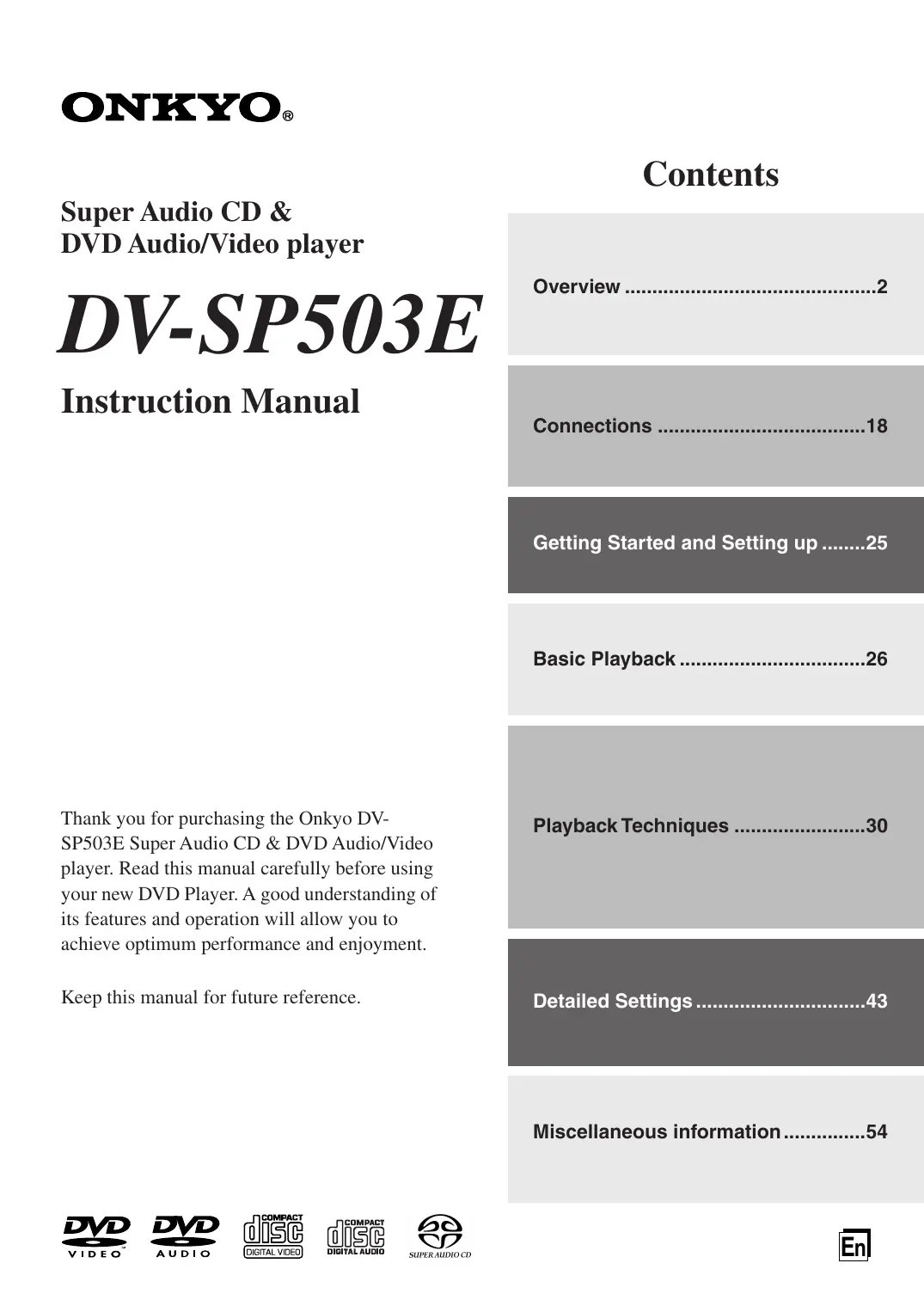 Download the instructions for your DVD player in PDF format for free! Find your manual DV-SP503E - ONKYO and take your electronic device back in hand. On this page are published all the documents necessary for the use of your device. DV-SP503E by ONKYO.
