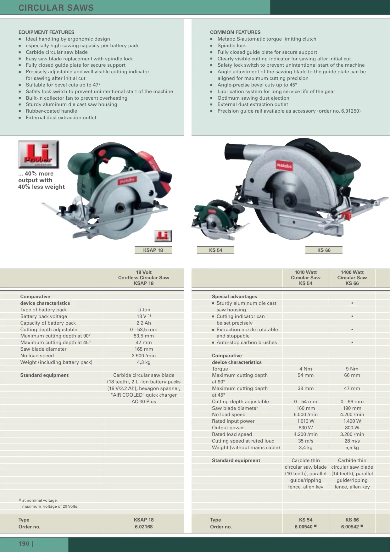 EQUIPMENT FEATURES Carbide circular saw blade for sawing after initial cut Rubber-coated handle Suitable for bevel cuts up to 47° Safety lock switch to prevent unintentional start of the machine Built-in collector fan to prevent overheating Sturdy aluminum die cast saw housing External dust extraction outlet Ideal handling by ergonomic design especially high sawing capacity per battery pack Easy saw blade replacement with spindle lock Fully closed guide plate for secure support Precisely adjustable and well visible cutting indicator COMMON FEATURES Metabo S-automatic torque limiting clutch Spindle lock Fully closed guide plate for secure support Clearly visible cutting indicator for sawing after initial cut Safety lock switch to prevent unintentional start of the machine Angle adjustment of the sawing blade to the guide plate can be aligned for maximum cutting precision Angle-precise bevel cuts up to 45° Lubrication system for long service life of the gear Optimum sawing dust ejection External dust extraction outlet Precision guide rail available as accessory (order no. 6.31250) .… 40% more output with 40% less weight 1010 Watt 1400 Watt Circular Saw ci KS 54 Comparative Special advantages device characteristics = Sturdy aluminum die cast . Type of battery pack Li-lon saw housing Battery pack voltage 18vr = Cutting indicator can . Capacity of battery pack 2,2Ah be set precisely Cutting depth adjustable 0-53,5 mm = Extraction nozzle rotatable . Maximum cutting depth at 90° 53,5 mm and stoppable Maximum cutting depth at 45° 42 mm = Auto-stop carbon brushes . Saw blade diameter 165 mm No load speed 2.500 /min Comparative Weight (including battery pack) 43kg device characteristics Torque 4Nm 9 Nm Standard equipment Carbide circular saw blade Maximum cutting depth 54 mm 66 mm {18 teeth), 2 Li-Ion battery packs at 90° {18 V/2.2 Ah), hexagon spanner, Maximum cutting depth 38 mm 47 mm “AIR COOLED" quick charger at 45° AC 30 Plus Cutting depth adjustable 0-54 mm 0-66 mm Saw blade diameter 160 mm 190 mm No load speed 6.000 /min 4.200 /min Rated input power 1.010W 1.400 W Output power 630W 800 W Rated load speed 4.200 /min 3.200 /min Cutting speed at rated load 35 m/s 28 m/s Weight (without mains cable) 3,4 kg 5,5 kg Standard equipment Carbide thin Carbide thin circular saw blade circular saw blade {10 teeth), parallel (14 teeth), parallel guide/ripping guide/ripping fence, allen key fence, allen key 1 at nominal voltage, maximum voltage of 20 Volts Type KSAP 18 Type KS 54 KS 66 Order no. 6.02168 Order no. 6.00540 = 6.00542 =