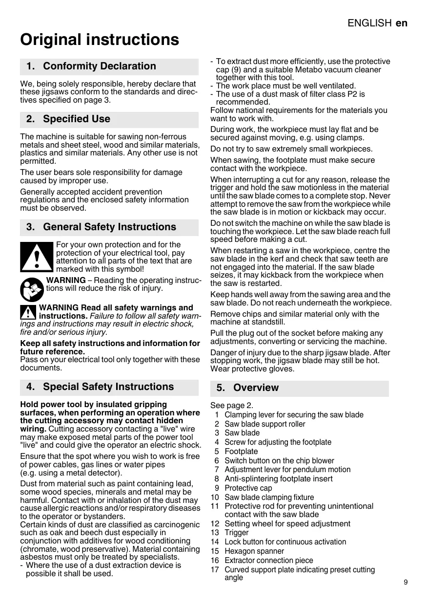 Hold power tool by insulated gripping surfaces, when performing an operation where the cutting accessory may contact hidden wiring. Cutting accessory contacting a "live" wire may make exposed metal parts of the power tool “live” and could give the operator an electric shock. Ensure that the spot where you wish to work is free of power cables, gas lines or water pipes (e.g. using a metal detector). Dust from material such as paint containing lead, some wood species, minerals and metal may be harmful. Contact with or inhalation of the dust may cause allergic reactions and/or respiratory diseases to the operator or bystanders. Certain kinds of dust are classified as carcinogenic such as oak and beech dust especially in conjunction with additives for wood conditioning (chromate, wood preservative). Material containing asbestos must only be treated by specialists. - Where the use of a dust extraction device is possible it shall be used. ENGLISH en - To extract dust more efficiently, use the protective cap (9) and a suitable Metabo vacuum cleaner together with this tool. - The work place must be well ventilated. - The use of a dust mask of filter class P2 is recommended. Follow national requirements for the materials you want to work with. During work, the workpiece must lay flat and be secured against moving, 8.g. using clamps. Do not try to saw extremely small workpieces. When sawing, the footplate must make secure contact with the workpiece. When interrupting a cut for any reason, release the trigger and hold the saw motionless in the material until the saw blade comes to a complete stop. Never attemptto remove the saw from the workpiece while the saw blade is in motion or kickback may occur. Donot switch the machine on while the saw blade is touching the workpiece. Let the saw blade reach full speed before making a cut. When restarting a saw in the workpiece, centre the saw blade in the kerf and check that saw teeth are not engaged into the material. If the saw blade seizes, it may kickback from the workpiece when the saw is restarted. Keep hands well away from the sawing area andthe saw blade. Do not reach undemeath the workpiece. Remove chips and similar material only with the machine at standstill. Pull the plug out of the socket before making any adjustments, converting or servicing the machine. Danger of injury due to the sharp jigsaw blade. After stopping work, the jigsaw blade may still be hot. Wear protective gloves.