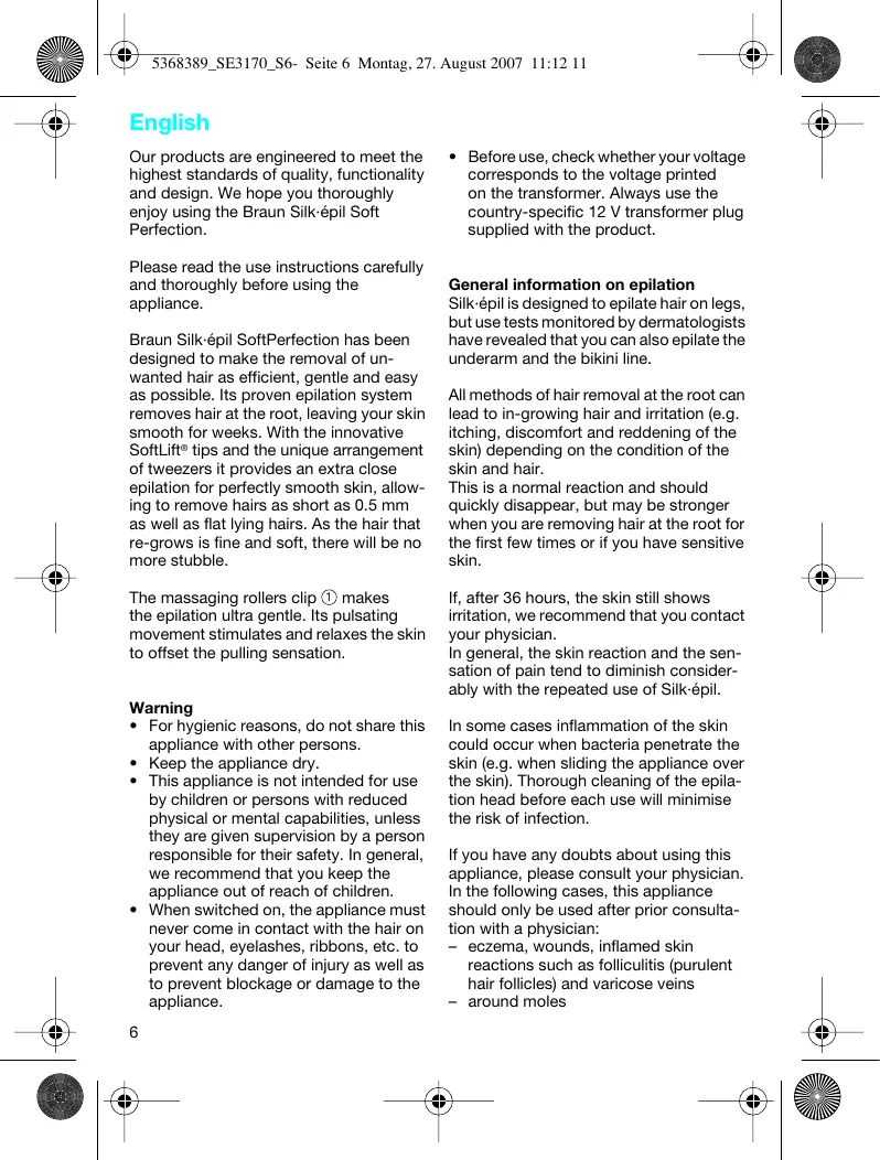 General information on epilation Silk·épil is designed to epilate hair on legs, but use tests monitored by dermatologists have revealed that you can also epilate the underarm and the bikini line. All methods of hair removal at the root can lead to in-growing hair and irritation (e.g. itching, discomfort and reddening of the skin) depending on the condition of the skin and hair. This is a normal reaction and should quickly disappear, but may be stronger when you are removing hair at the root for the first few times or if you have sensitive skin. If, after 36 hours, the skin still shows irritation, we recommend that you contact your physician. In general, the skin reaction and the sensation of pain tend to diminish considerably with the repeated use of Silk·épil. In some cases inflammation of the skin could occur when bacteria penetrate the skin (e.g. when sliding the appliance over the skin). Thorough cleaning of the epilation head before each use will minimise the risk of infection. If you have any doubts about using this appliance, please consult your physician. In the following cases, this appliance should only be used after prior consultation with a physician: – eczema, wounds, inflamed skin reactions such as folliculitis (purulent hair follicles) and varicose veins – around moles