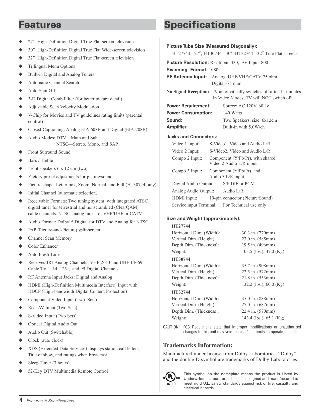 Features Specifications 27″ High-Definition Digital True Flat-screen television 30″ High-Definition Digital True Flat Wide-screen television 32″ High-Definition Digital True Flat-screen television Trilingual Menu Options Built-in Digital and Analog Tuners Picture Tube Size (Measured Diagonally): HT27744 - 27″; HT30744 - 30″; HT32744 - 32″ True Flat screens Picture Resolution: RF: Input–330, AV Input–800 Scanning Format: 1080i Analog–UHF/VHF/CATV 75 ohm Digital–75 ohm RF Antenna Input: Automatic Channel Search Auto Shut Off 3-D Digital Comb Filter (for better picture detail) No Signal Reception: TV automatically switches off after 15 minutes In Video Modes, TV will NOT switch off Adjustable Scan Velocity Modulation Power Requirement: Source: AC 120V, 60Hz V-Chip for Movies and TV guidelines rating limits (parental control) Power Consumption: 140 Watts Sound: Amplifier: Two Speakers, size: 6x12cm Built-in with 5.0W/ch Closed-Captioning: Analog EIA-608B and Digital (EIA-708B) Audio Modes: DTV—Main and Sub NTSC—Stereo, Mono, and SAP Jacks and Connectors: Video 1 Input: S-Video1, Video and Audio L/R Front Surround Sound Video 2 Input: S-Video2, Video and Audio L/R Bass / Treble Compo 2 Input: Component (Y/Pb/Pr), with shared Video 2 Audio L/R input Compo 3 Input: Component (Y/Pb/Pr), and Audio 3 L/R input Front speakers 6 x 12 cm (two) Factory preset adjustments for picture/sound Picture shape: Letter box, Zoom, Normal, and Full (HT30744 only) Initial Channel (automatic selection) Receivable Formats: Two tuning system: with integrated ATSC digital tuner for terrestrial and nonscrambled (ClearQAM) cable channels. NTSC analog tuner for VHF/UHF or CATV Audio Format: Dolby Digital for DTV and Analog for NTSC PAP (Picture-and-Picture) split-screen Channel Scan Memory Color Enhancer Auto Flesh Tone Receives 181 Analog Channels [VHF 2~13 and UHF 14~69; Cable TV 1, 14~125]; and 99 Digital Channels RF Antenna Input Jacks: Digital and Analog HDMI (High-Definition Multimedia Interface) Input with HDCP (High-bandwidth Digital Content Protection) Component Video Input (Two Sets) Rear AV Input (Two Sets) S-Video Input (Two Sets) Optical Digital Audio Out Audio Out (Switchable) Clock (auto clock) XDS (Extended Data Services) displays station call letters, Title of show, and ratings when broadcast Sleep Timer (3 hours) 52-Key DTV Multimedia Remote Control