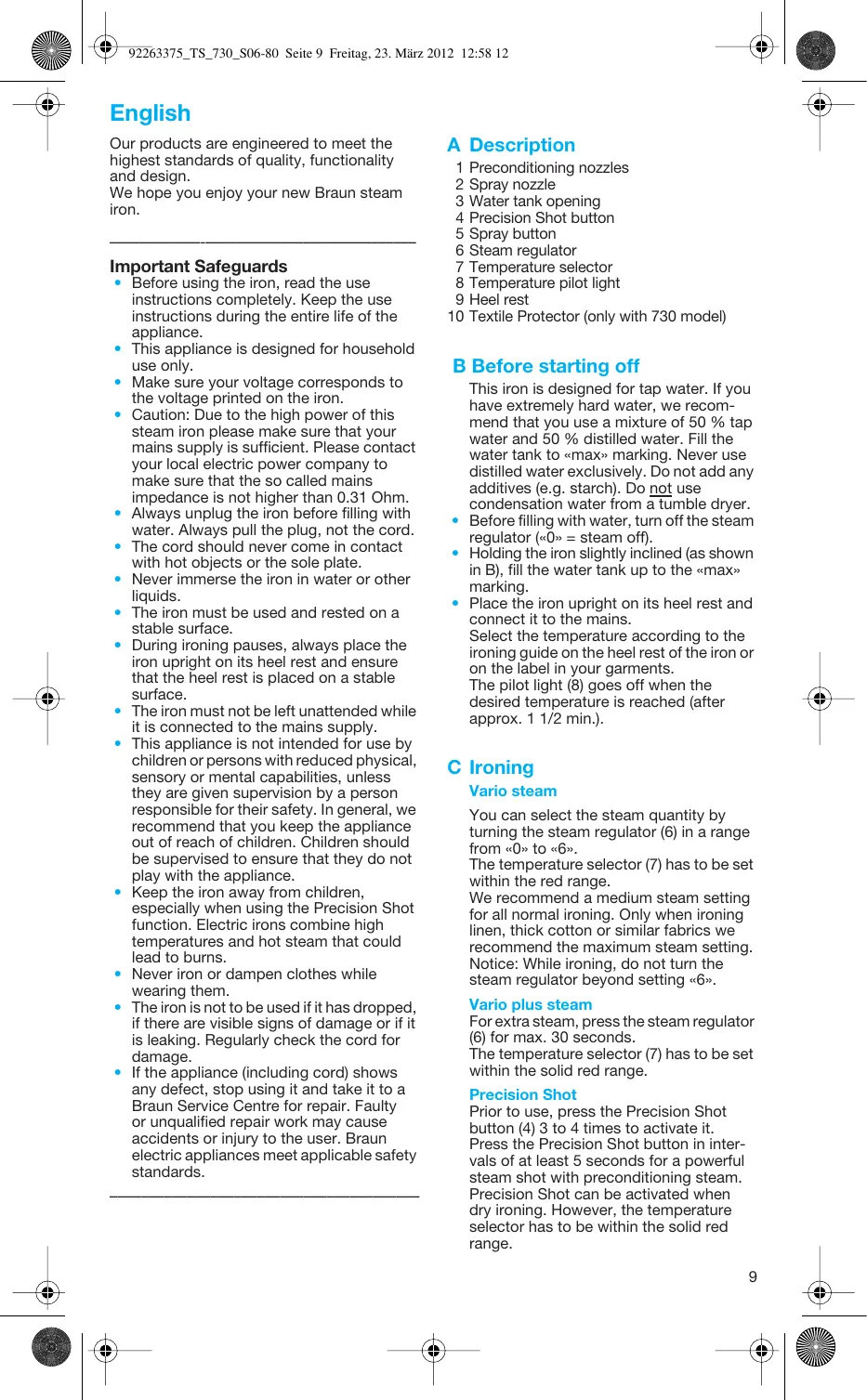 Preconditioning nozzles Spray nozzle Water tank opening Precision Shot button Spray button Steam regulator Temperature selector Temperature pilot light Heel rest Textile Protector (only with 730 model) B Before starting off This iron is designed for tap water. If you have extremely hard water, we recommend that you use a mixture of 50 % tap water and 50 % distilled water. Fill the water tank to «max» marking. Never use distilled water exclusively. Do not add any additives (e.g. starch). Do not use condensation water from a tumble dryer.