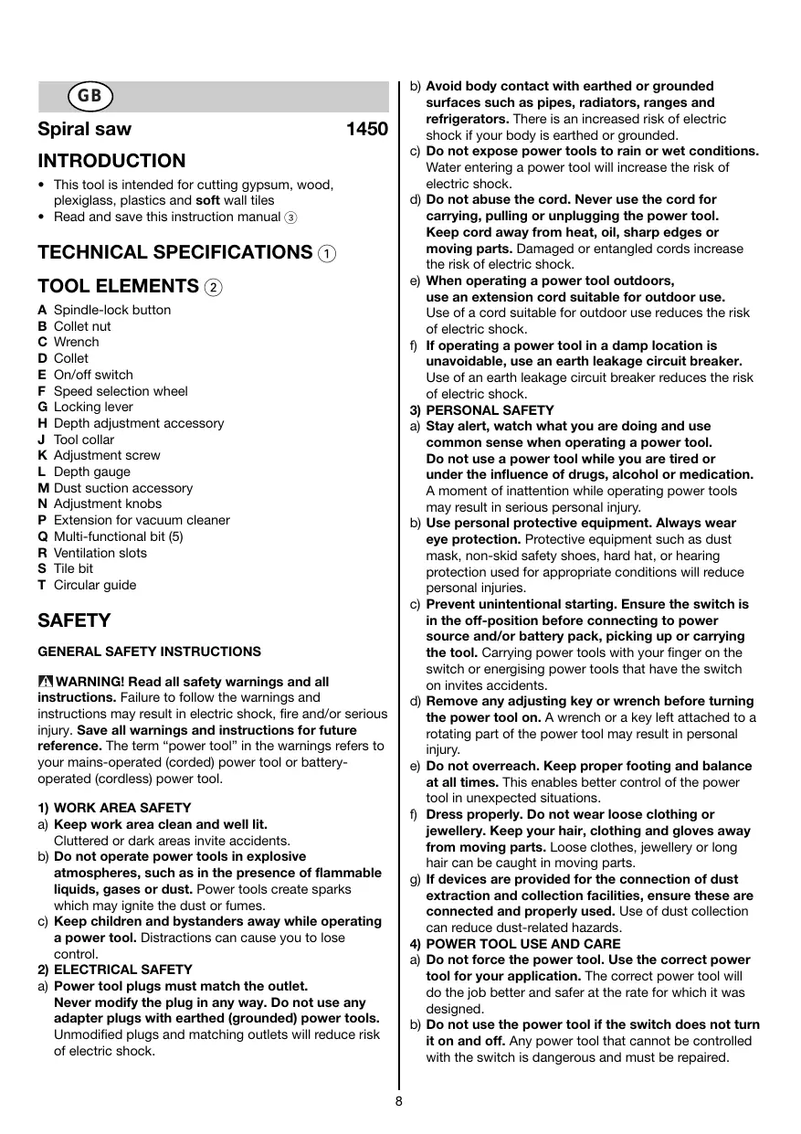 Spiral saw INTRODUCTION +_ This tool is intended for cutting gypsum, wood, plexiglas, plastics and soft wall iles +_ Read and save this instruction manual (3) TECHNICAL SPECIFICATIONS (1) TOOL ELEMENTS (2 A Spindie-lock button B Collet nut C Wrench D Collet E Onoff switch F Speed selection wheel G Locking lever H Depth adjustment accessory J Tool collar K Adjustment screw L_ Depth gauge M Dust suction accessory N Adjustment knobs P. Extension for vacuum cleaner Q Muti-functional bit (5) R Ventilation slots S Tile bit T Circular guide SAFETY