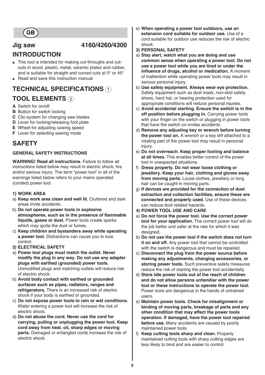 SAFETY INSTRUCTIONS FOR JIG SAWS Always keep the cord away from moving parts of the tool Ifthe cord is damaged or cut through while working, do not touch the cord, but immediately disconnect the plug Never use tool when cord is damaged; have it replaced by a qualiied person