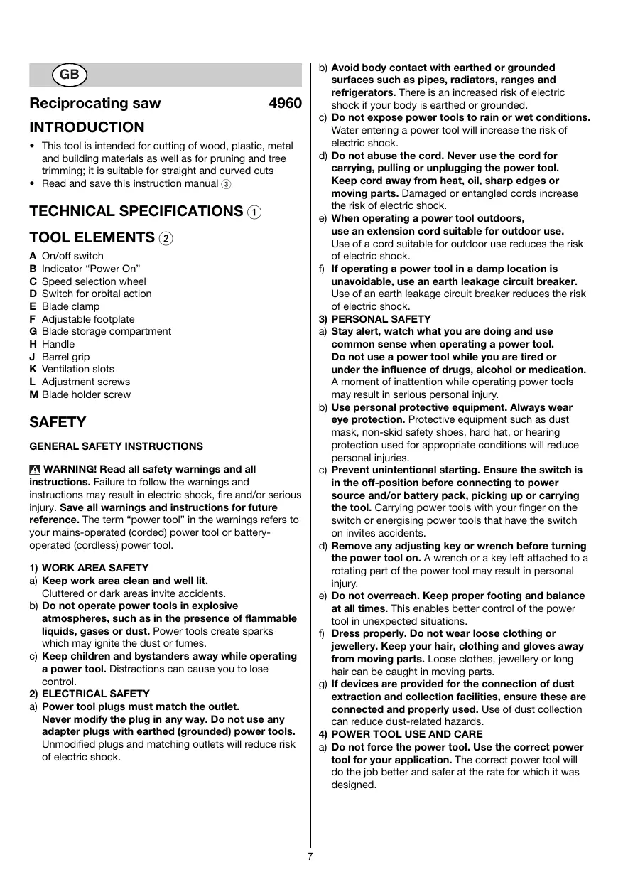 TECHNICAL SPECIFICATIONS (1) TOOL ELEMENTS (2 A Onvoff switch B Indicator “Power On” C Speed selection wheel D Switch for orbital action E Blade clamp F Adjustable footplate G Blade storage compartment H Handie J Barre! grip K Ventilation slots L_Adjustment screws M Blade holder screwr SAFETY