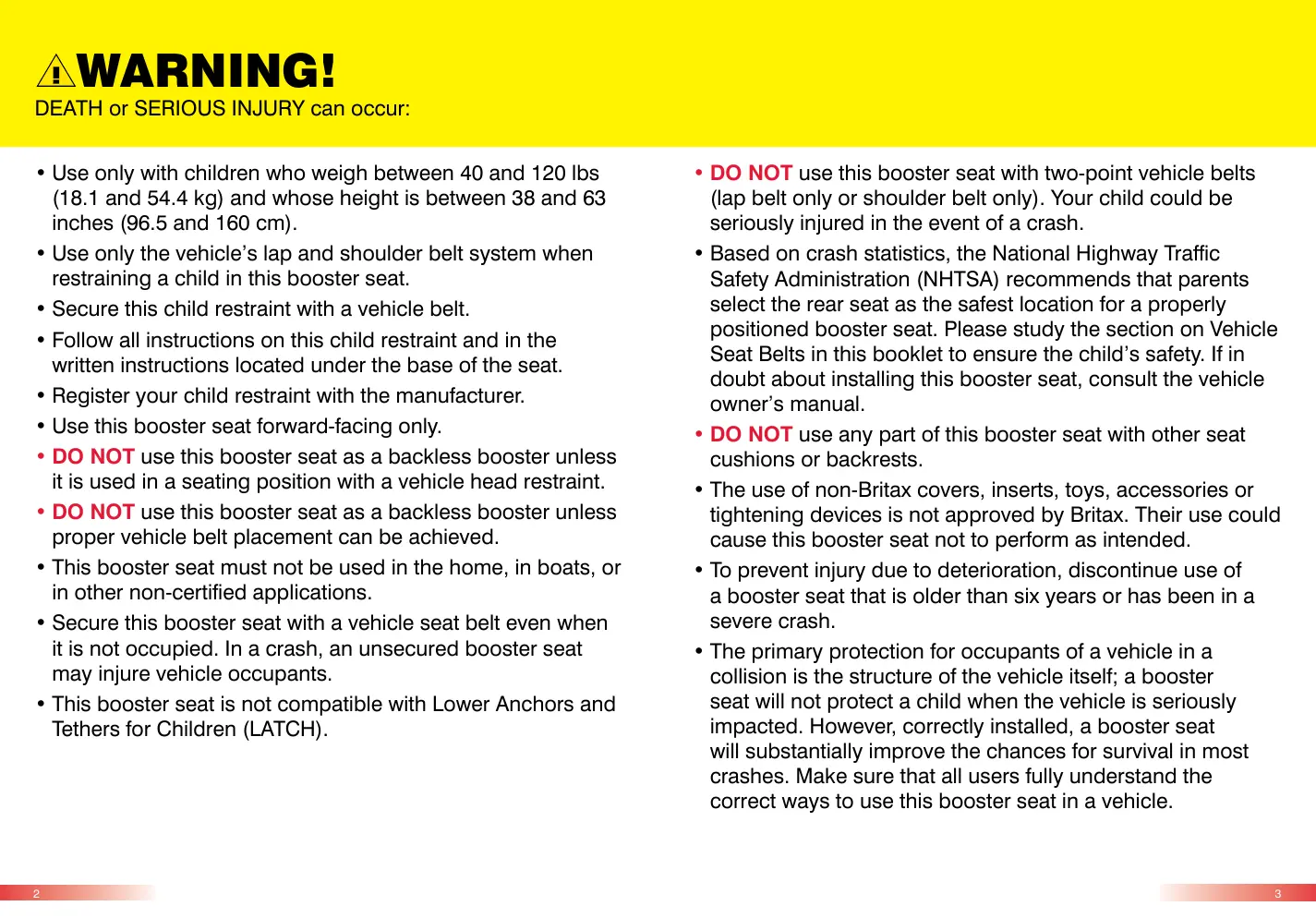 The use of non-Britax covers, inserts, toys, accessories or tightening devices is not approved by Britax. Their use could cause this booster seat not to perform as intended.