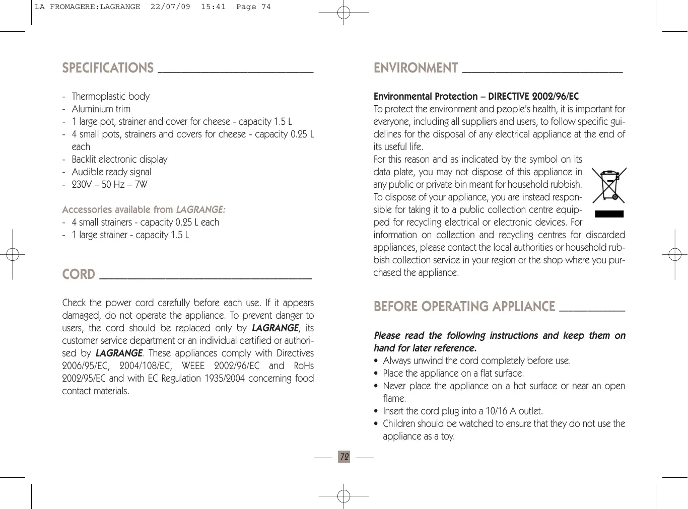 Check the power cord carefully before each use. If it appears damaged, do not operate the appliance. To prevent danger to users, the cord should be replaced only by LAGRANGE, its customer service department or an individual certified or authorised by LAGRANGE. These appliances comply with Directives 2006/95/EC, 2004/108/EC, WEEE 2002/96/EC and RoHs 2002/95/EC and with EC Regulation 1935/2004 concerning food contact materials.
