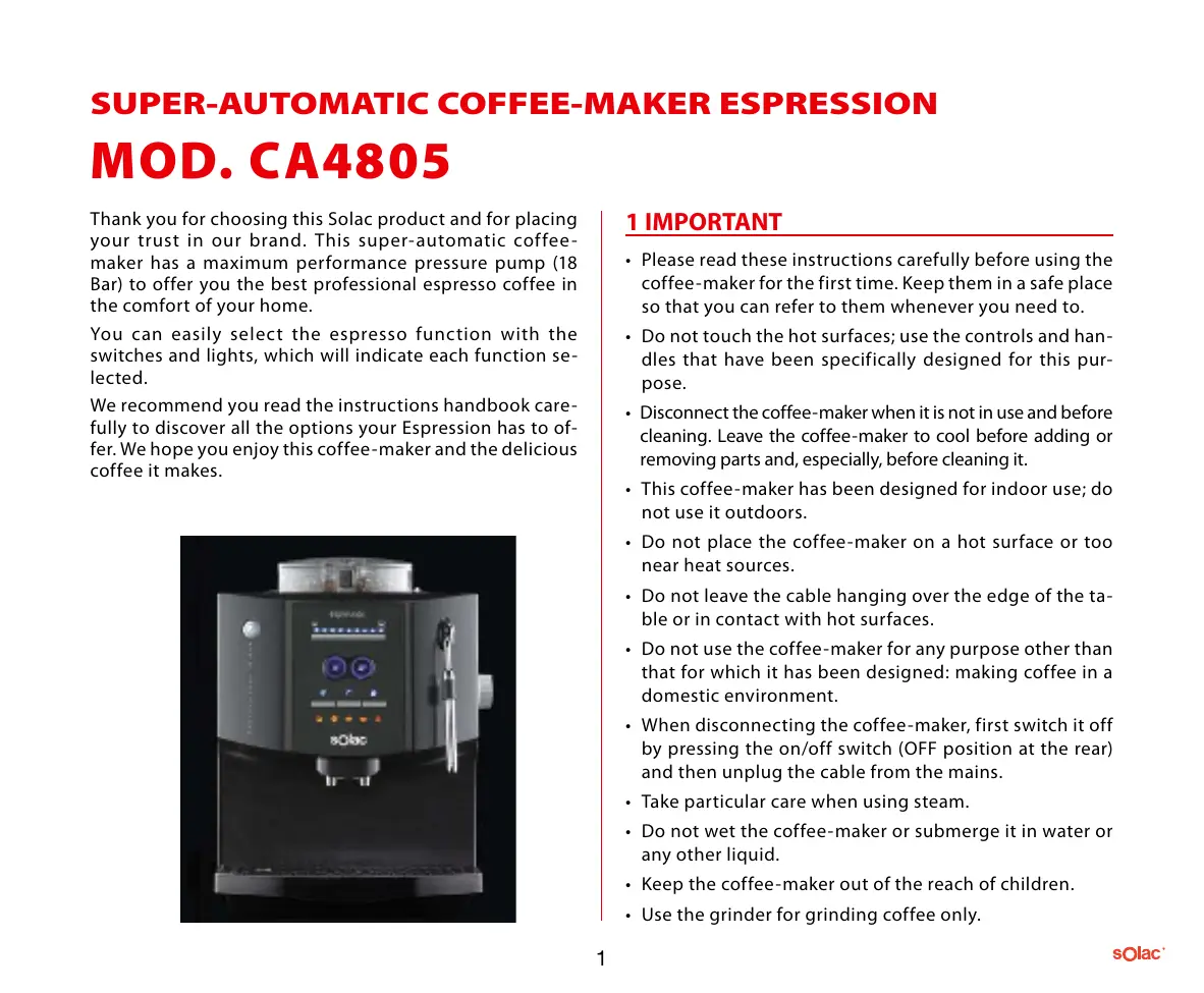 MOD. CA4805 Thank you for choosing this Solac product and for placing your trust in our brand. This super-automatic coffee maker has a maximum performance pressure pump (18 Bar) to offer you the best professional espresso coffee in the comfort of your home. You can easily select the espresso function with the switches and lights, which will indicate each function selected. We recommend you read the instructions handbook carefully to discover all the options your Espression has to offer. We hope you enjoy this coffee-maker and the delicious coffee it makes. 1 IMPORTANT