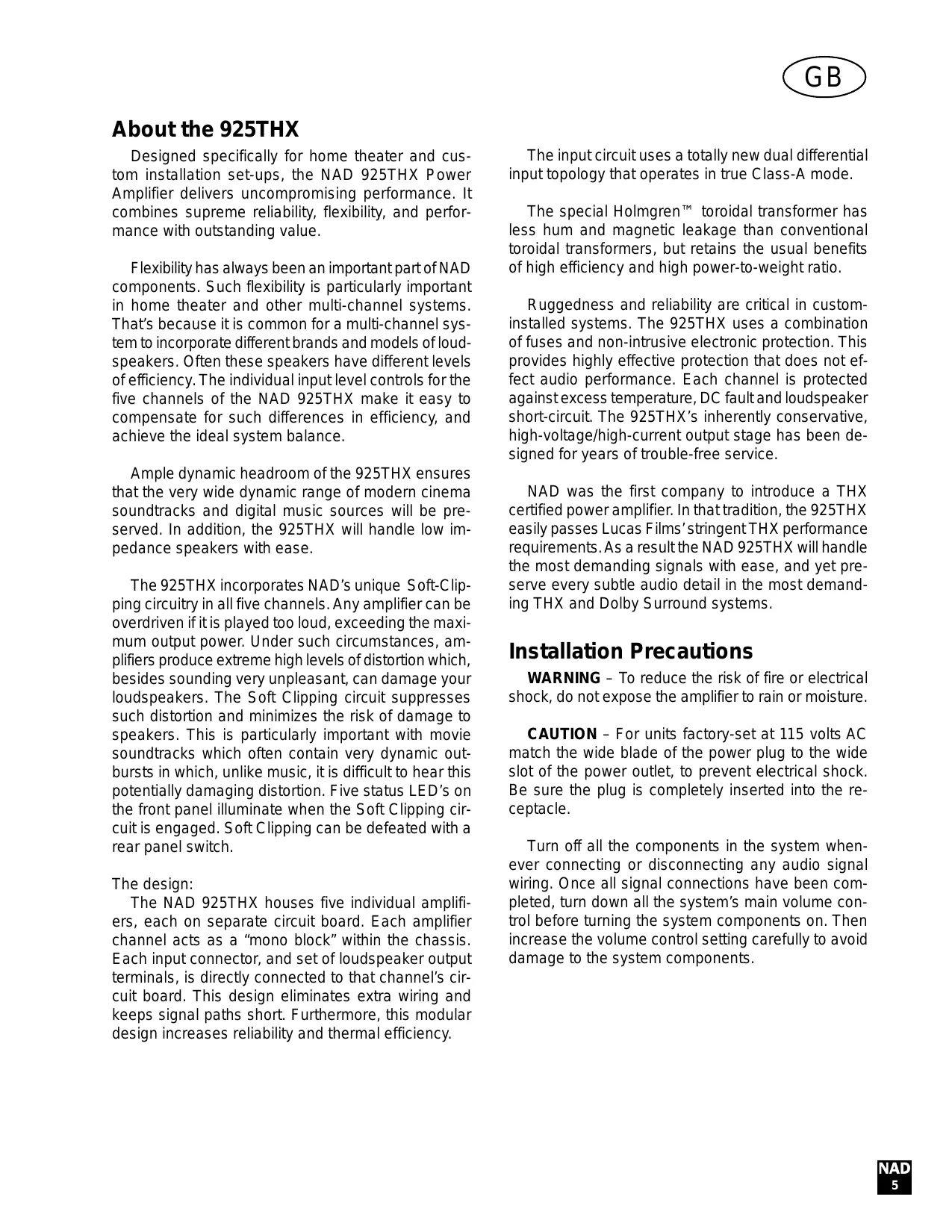 La souplesse a toujours été un critère essentiel pour les composants NAD. Une telle souplesse est particulièrement importante pour les chaînes de type auditorium à domicile et les autres chaînes multi-voies, car une chaîne multi-voies comporte souvent des haut parleurs de marques et de modèles différents. Ces haut parleurs sont souvent caractérisés par des rendements différents. Les commandes individuelles de niveau d’entrée pour les cinq voies du NAD 925THX permettent de compenser sans problème ces différences de rendement et d’amener le système à l’équilibre idéal. La vaste échappée dynamique du 925THX garantit un rendu parfait de la totalité de la plage dynamique très étendue des bandes son du cinéma moderne et des sources de musique numériques. De plus, le 925THX n’a aucun problème pour s’adapter à des haut parleurs basse impédance. Le circuit d’écrêtage doux (Soft Clipping), unique à NAD, équipe les cinq voies du 925THX. Tout amplificateur peut être poussé au-delà de ses limites et de sa puissance maximale si le volume est trop fort. Dans ces cas là, les amplificateurs produisent des niveaux extrêmes de distorsion qui, outre le fait qu’ils sont très désagréables à entendre, peuvent endommager les haut parleurs. Le dispositif d’écrêtage doux (Soft Clipping) supprime ces distorsions et réduit les risques de détérioration des haut parleurs. Cette fonctionnalité s’avère plus particulièrement utile pour les bandes sons des films qui comportent souvent des éclats très dynamiques pour lesquels, contrairement à la musique, la distorsion potentiellement préjudiciable pour les haut parleurs est difficilement audible. Cinq diodes électroluminescentes sont prévues sur la face parlante de l’amplificateur, et s’allument lorsque le dispositif d’écrêtage doux est actif. Il est possible de couper l’écrêtage doux grâce à un interrupteur sur la face arrière. La conception : Le NAD 925THX comporte cinq amplificateurs individuels, chacun étant implanté sur sa propre carte à circuit imprimé. Chaque voie d’amplificateur constitue un ensemble distinct à l’intérieur du châssis. Chaque connecteur d’entrée et chaque jeu de bornes de sortie haut parleurs est relié directement à la carte correspondant à sa propre voie. Cette configuration évite les câblages superflus et garantit que le chemin parcouru par les signaux est le plus court possible. En outre, cette conception modulaire augmente la fiabilité et le rendement thermique.