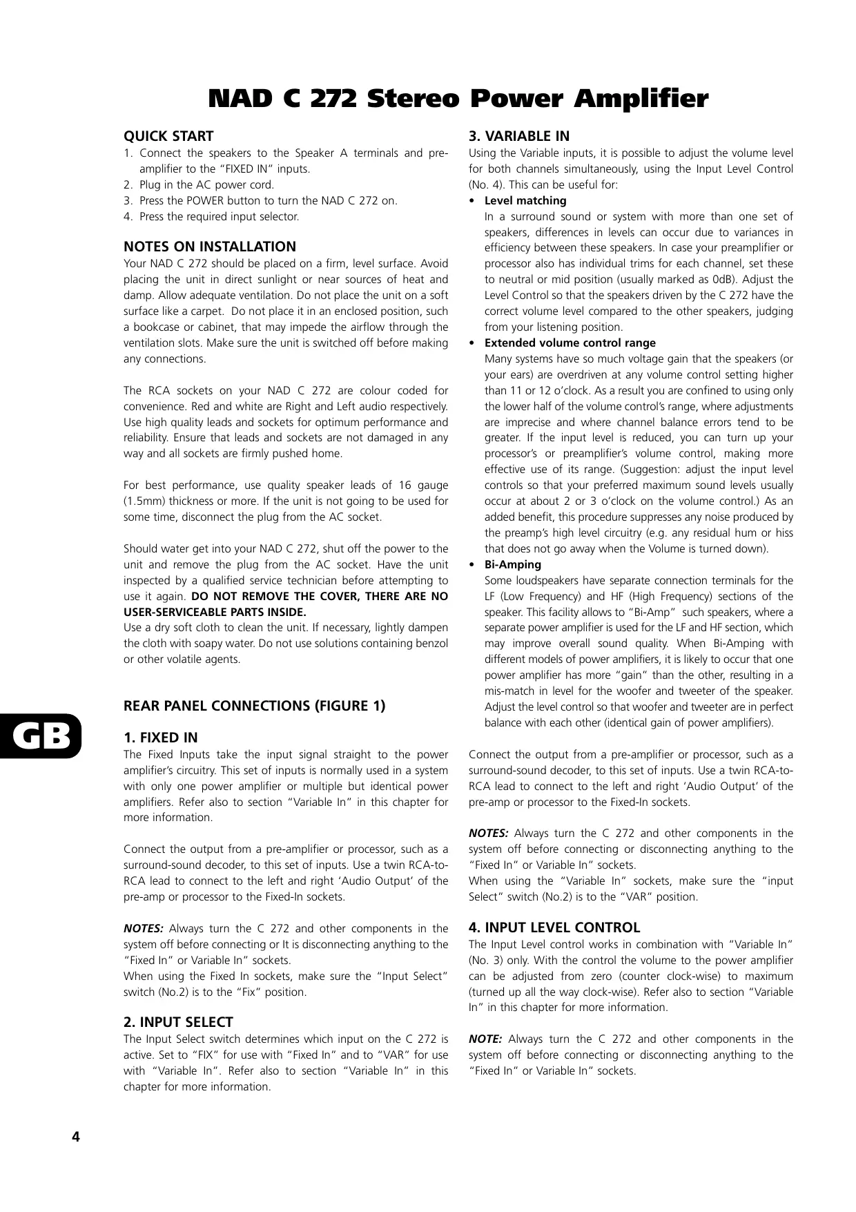 Your NAD C 272 should be placed on a firm, level surface. Avoid placing the unit in direct sunlight or near sources of heat and damp. Allow adequate ventilation. Do not place the unit on a soft surface like a carpet. Do not place it in an enclosed position, such a bookcase or cabinet, that may impede the airflow through the ventilation slots. Make sure the unit is switched off before making any connections. The RCA sockets on your NAD C 272 are colour coded for convenience. Red and white are Right and Left audio respectively. Use high quality leads and sockets for optimum performance and reliability. Ensure that leads and sockets are not damaged in any way and all sockets are firmly pushed home. For best performance, use quality speaker leads of 16 gauge (1.5mm) thickness or more. If the unit is not going to be used for some time, disconnect the plug from the AC socket. Should water get into your NAD C 272, shut off the power to the unit and remove the plug from the AC socket. Have the unit inspected by a qualified service technician before attempting to use it again. DO NOT REMOVE THE COVER, THERE ARE NO USER-SERVICEABLE PARTS INSIDE. Use a dry soft cloth to clean the unit. If necessary, lightly dampen the cloth with soapy water. Do not use solutions containing benzol or other volatile agents. REAR PANEL CONNECTIONS (FIGURE 1)