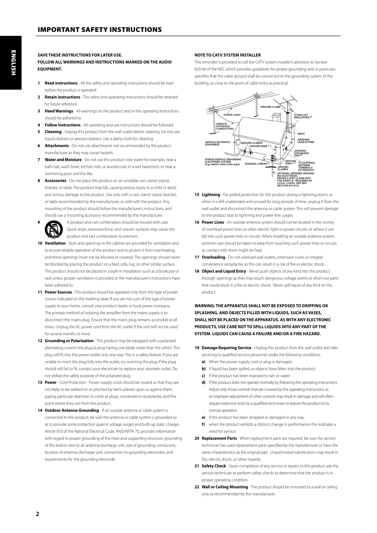 16 Câbles haute tension - Un système d’antenne extérieure ne doit pas être placé près de lignes haute tension aériennes ou d’autres circuits d’éclairage ou de