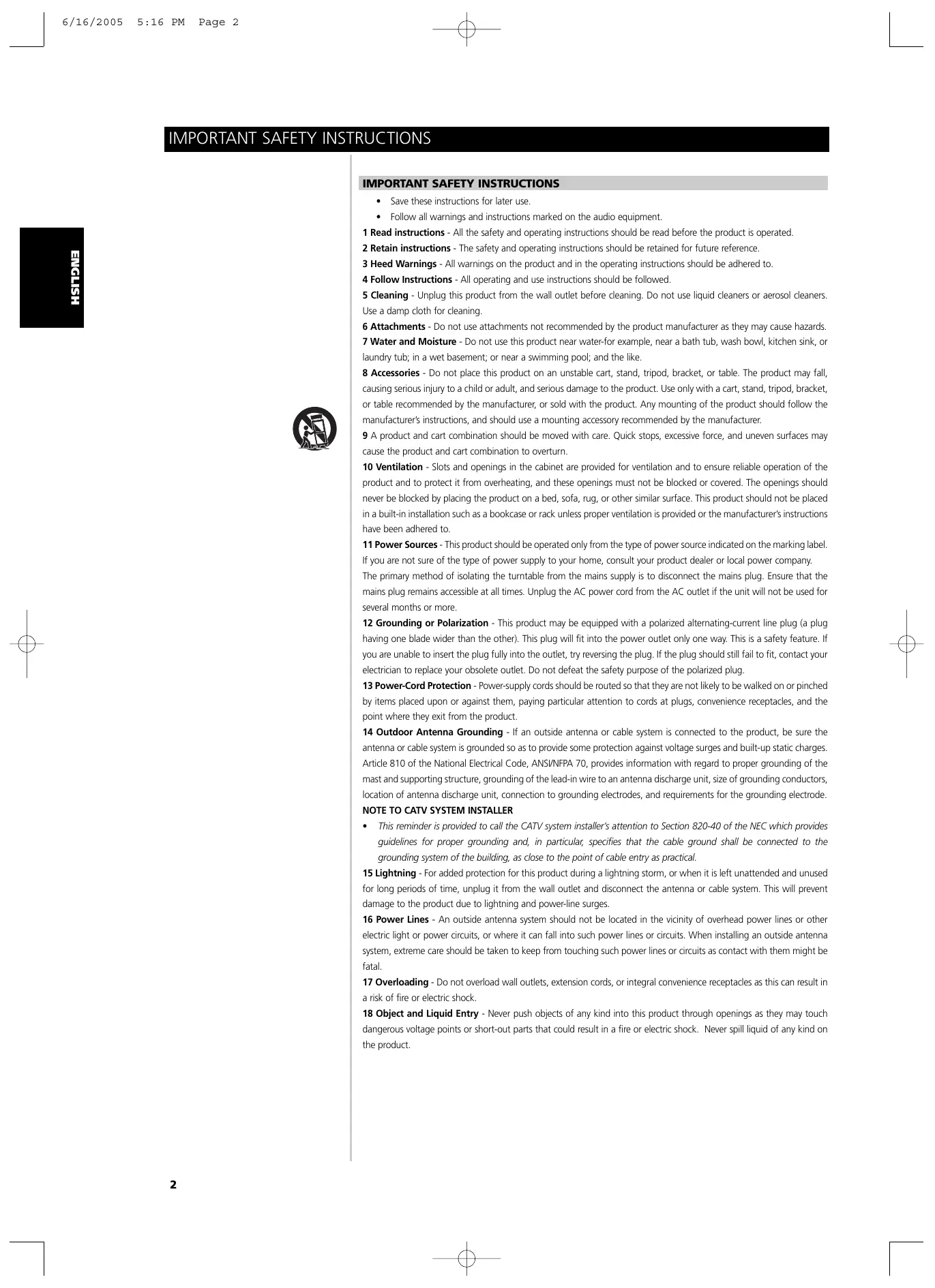 1 Eau et Humidité - Cet appareil ne doit pas être utilisé à proximité de l'eau, par exemple près d'une baignoire, d'un lavabo, d'une piscine, etc ... 2 Chaleur - N'utilisez pas cet appareil à proximité d'une source de chaleur comme une bouche de chauffage, une cuisinière ou tout autre appareil dégageant de la chaleur. L'appareil ne doit pas être mis en présence de températures inférieures à 5 °C ou supérieures à 35 °C. 3 Support - Posez l'appareil sur une surface plane et horizontale. 4 Aération - L'appareil doit être installé dans un endroit où l'air peut circuler librement autour, afin de bien évacuer la chaleur dégagée. Prévoyez un dégagement de 10 cm derrière et au dessus de l'appareil et de 5 cm de chaque côté. - Ne posez pas l'appareil sur un lit, un tapis ou une surface semblable, car cela boucherait les ouvertures d'aération sur la face inférieure. - N'installez pas l'appareil dans une bibliothèque fermée ou dans un rack hermétique, car la ventilation de l'appareil ne serait pas assurée correctement. 5 Pénétration de corps étrangers ou de liquides - Veillez à ce qu'aucun objet ni aucun liquide ne pénètre à l'intérieur de l'appareil à travers les ouvertures d'aération. 6 Chariots et supports - Si vous placez ou installez l'appareil sur un support ou sur un chariot, les déplacements doivent être effectués en faisant très attention. Les arrêts brusques, les efforts excessifs ou les sols accidentés risqueraient de renverser le chariot et l'appareil. 7 Condensation - De l'humidité peut se déposer sur la lentille de lecture des CD lorsque : • Vous déplacez l'appareil d'un endroit frais à un endroit plus chaud. • Vous venez d'allumer le chauffage. • Vous utilisez l'appareil dans une pièce très humide. • L'appareil est refroidi par un climatiseur. Si de la condensation s'est formée à l'intérieur de cet appareil, cela peut en perturber le fonctionnement. Si cela arrive, attendez quelques heures puis essayez à nouveau. 8 Fixation au mur ou au plafond - L'appareil ne doit pas être fixé au mur ou au plafond, à moins que cela ne soit prévu dans les Instructions de l'Utilisateur.