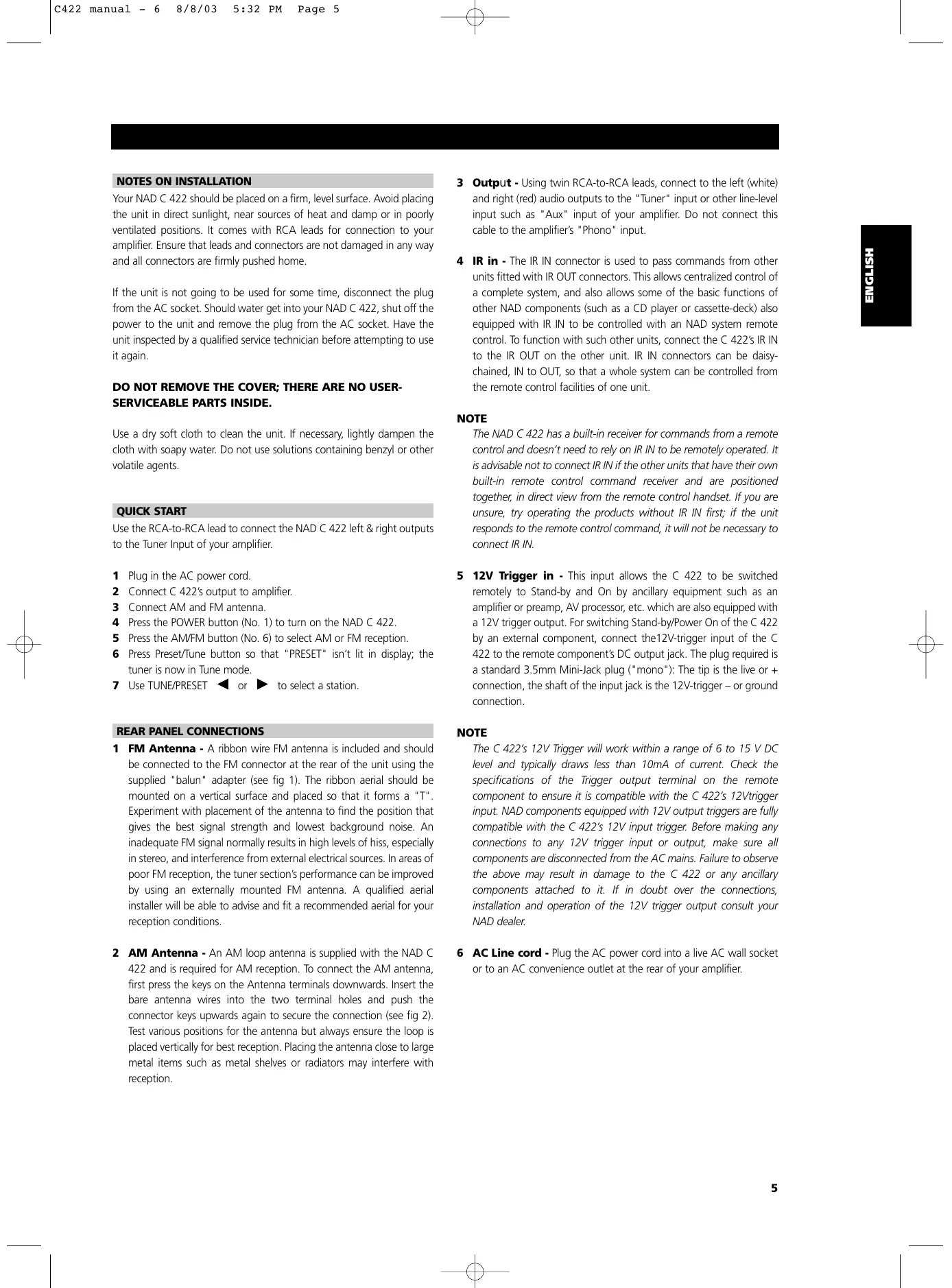The C 422's 12V Trigger will work within a range of 6 to 15 V DC level and typically draws less than 10mA of current. Check the specifications of the Trigger output terminal on the remote component to ensure it is compatible with the C 422's 12V trigger input. NAD components equipped with 12V output triggers are fully compatible with the C 422's 12V input trigger. Before making any connections to any 12V trigger input or output, make sure all components are disconnected from the AC mains. Failure to observe the above may result in damage to the C 422 or any ancillary components attached to it. If in doubt over the connections, installation and operation of the 12V trigger output consult your NAD dealer.