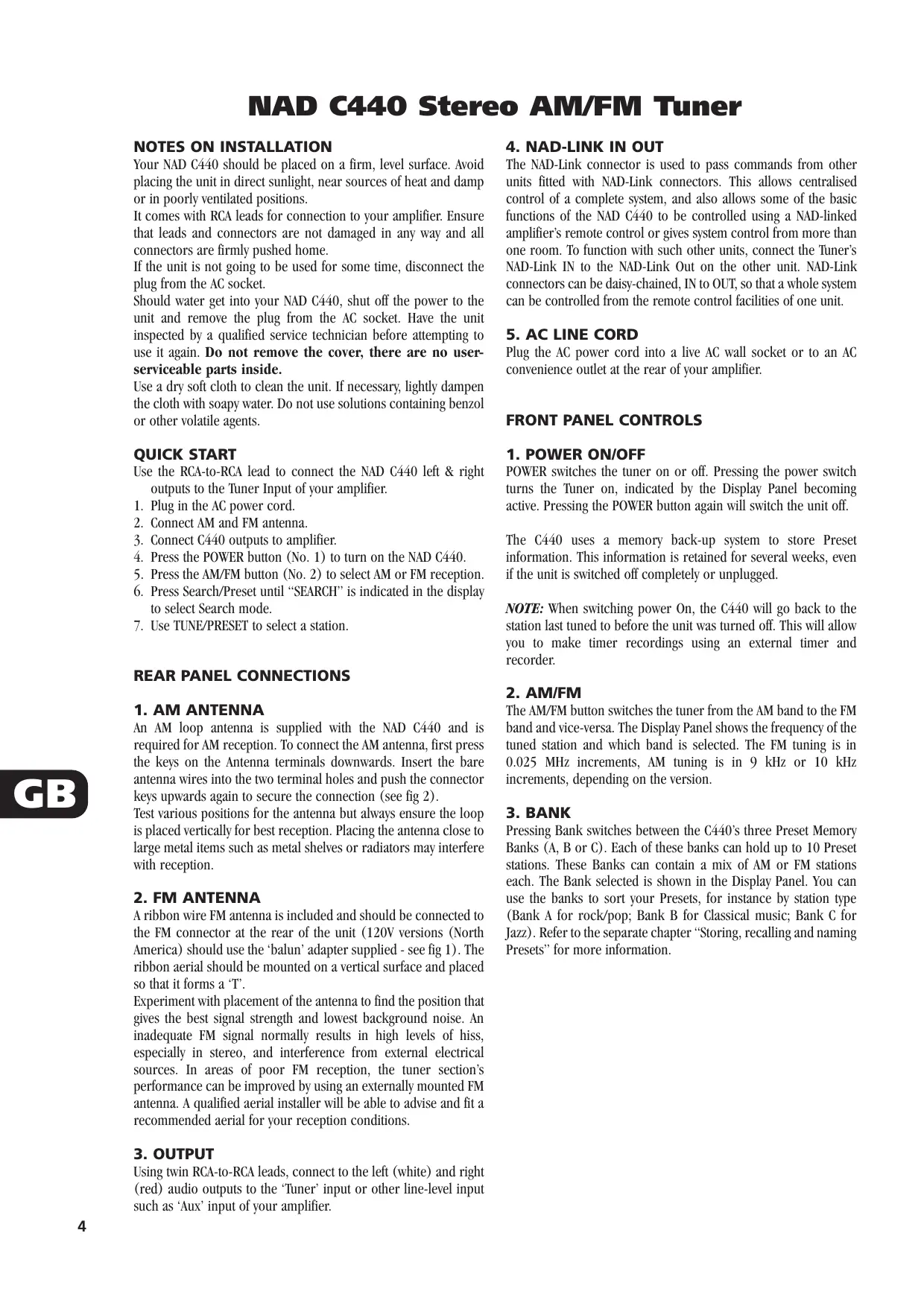 “balun” fourni (Voir figure 1). L’antenne câble plat doit être fixée sur une surface verticale, et doit former un “T”. Faire des essais en mettant l’antenne dans différentes positions, de manière à obtenir le meilleur signal possible avec un minimum de bruit de fond. Un signal FM insuffisant entraîne beaucoup de sifflements, surtout en réception stéréophonique, et de l’interférence en provenance de sources électriques externes. Dans les endroits où la réception FM est faible, il est possible d’améliorer les performances du tuner en utilisant une antenne FM montée à l’extérieur du bâtiment. Un installateur d’antennes qualifié pourra donner les conseils appropriés, et poser une antenne adaptée aux conditions de réception locales. 3. SORTIE A l’aide des câbles jumelés RCA-à-RCA, brancher les sorties audio gauche (blanc) et droite (rouge) à l’entrée “Tuner” ou à une autre entrée de niveau ligne, telle que l’entrée “Aux” de votre amplificateur. Ne pas connecter ce câble aux jacks d’entrée RCA de l’amplificateur. 4. ENTREE/SORTIE LIAISON-NAD [NAD-LINK IN, OUT] Le connecteur de Liaison-NAD [NAD-Link] sert à relayer les commandes en provenance d’autres appareils équipés de connecteurs de Liaison-NAD. Ceci permet d’assurer une commande centralisée pour tout un réseau, et permet aussi de télécommander certaines fonctions de base du NAD C440 à l’aide de la télécommande à Liaison-NAD de l’amplificateur ou de commander le réseau depuis plusieurs pièces. Pour assurer le relais vers d’autres appareils, relier le connecteur d’ENTREE Liaison-NAD [NAD-Link IN] au connecteur de SORTIE Liaison-NAD [NAD-Link OUT] de l’autre appareil. Il est possible de relier les connecteurs de Liaison-NAD en chaîne, ENTREE vers SORTIE, et donc de commander tout un réseau d’appareils à l’aide de la télécommande d’un seul d’entre eux. 5. CORDON ALIMENTATION SECTEUR Brancher ce cordon à une prise murale secteur ou à une prise commutée à l’arrière de votre amplificateur. COMMANDES SUR LA FACE PARLANTE 1. MARCHE/ARRET [POWER ON/OFF] Le bouton-poussoir Marche/Arrêt [POWER] sert à mettre le tuner sous tension et hors tension. Une impulsion sur le bouton Marche/Arrêt [POWER] met le Tuner sous tension et active l’affichage. Une nouvelle impulsion sur le bouton MARCHE-ARRET [POWER] met l’appareil hors tension. Le C440 dispose d’une mémoire auxiliaire pour sauvegarder les informations préréglées. L’appareil retient ces informations en mémoire pendant plusieurs semaines; même dans le cas où il est tout à fait mis hors tension ou débranché. NOTA: Lorsque vous mettez l’appareil sous tension [impulsion sur le bouton POWER], le C440 remettra la station qui était sélectionnée avant la mise hors tension de l’appareil. Ceci vous permet de faire des enregistrements chronométrés à l’aide d’une minuterie et un magnétophone externes.