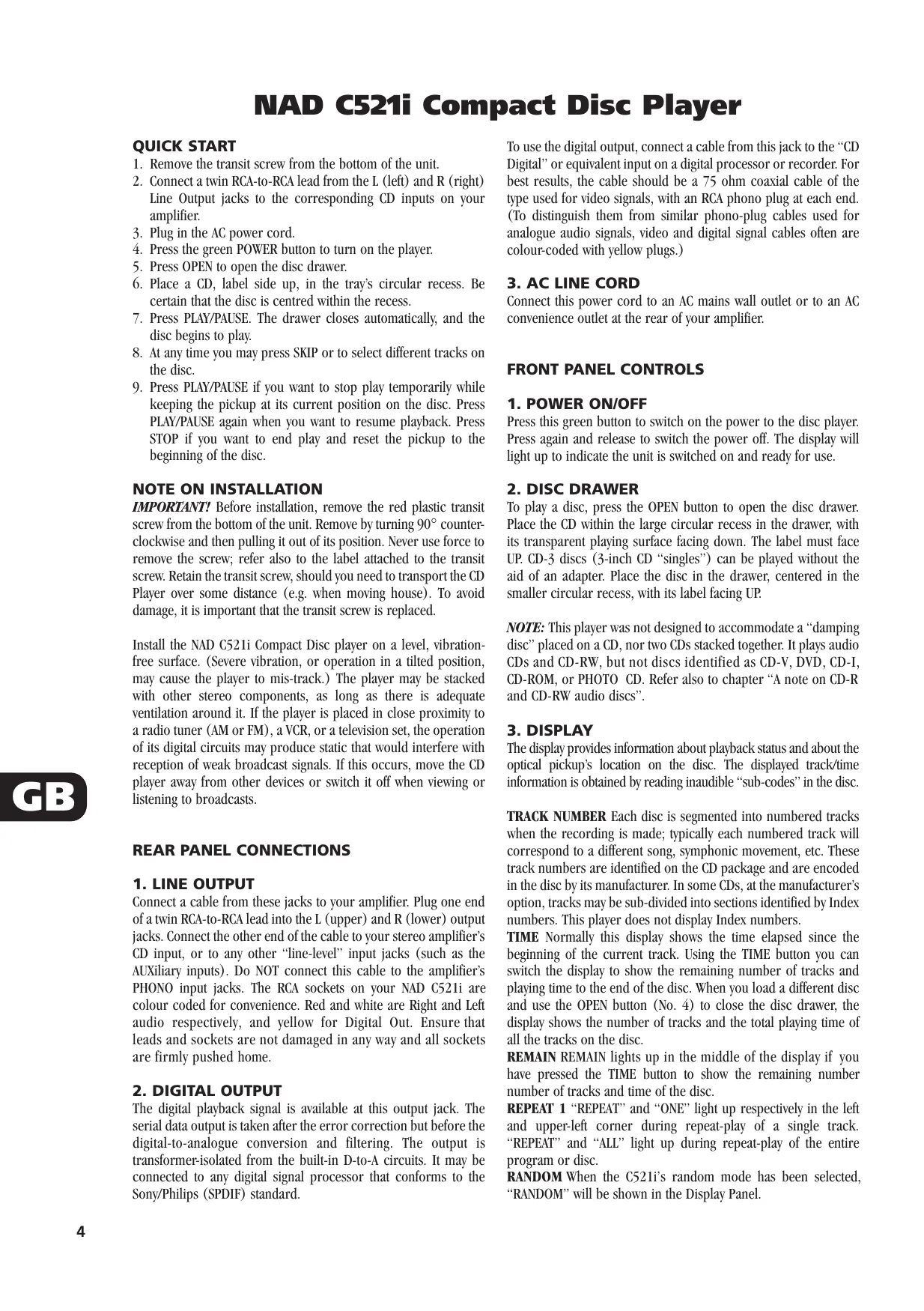 QUICK START 1. Remove the transit screw from the bottom of the unit. 2. Connect a twin RCA-to-RCA lead from the L (left) and R (right) Line Output jacks to the corresponding CD inputs on your amplifier. 3. Plug in the AC power cord. 4. Press the green POWER button to turn on the player. 5. Press OPEN to open the disc drawer. 6. Place a CD, label side up, in the tray’s circular recess. Be certain that the disc is centred within the recess. 7. Press PLAY/PAUSE. The drawer closes automatically, and the disc begins to play. 8. At any time you may press SKIP or to select different tracks on the disc. 9. Press PLAY/PAUSE if you want to stop play temporarily while keeping the pickup at its current position on the disc. Press PLAY/PAUSE again when you want to resume playback. Press STOP if you want to end play and reset the pickup to the beginning of the disc. NOTE ON INSTALLATION IMPORTANT! Before installation, remove the red plastic transit screw from the bottom of the unit. Remove by turning 90° counterclockwise and then pulling it out of its position. Never use force to remove the screw; refer also to the label attached to the transit screw. Retain the transit screw, should you need to transport the CD Player over some distance (e.g. when moving house). To avoid damage, it is important that the transit screw is replaced. Install the NAD C521i Compact Disc player on a level, vibrationfree surface. (Severe vibration, or operation in a tilted position, may cause the player to mis-track.) The player may be stacked with other stereo components, as long as there is adequate ventilation around it. If the player is placed in close proximity to a radio tuner (AM or FM), a VCR, or a television set, the operation of its digital circuits may produce static that would interfere with reception of weak broadcast signals. If this occurs, move the CD player away from other devices or switch it off when viewing or listening to broadcasts.