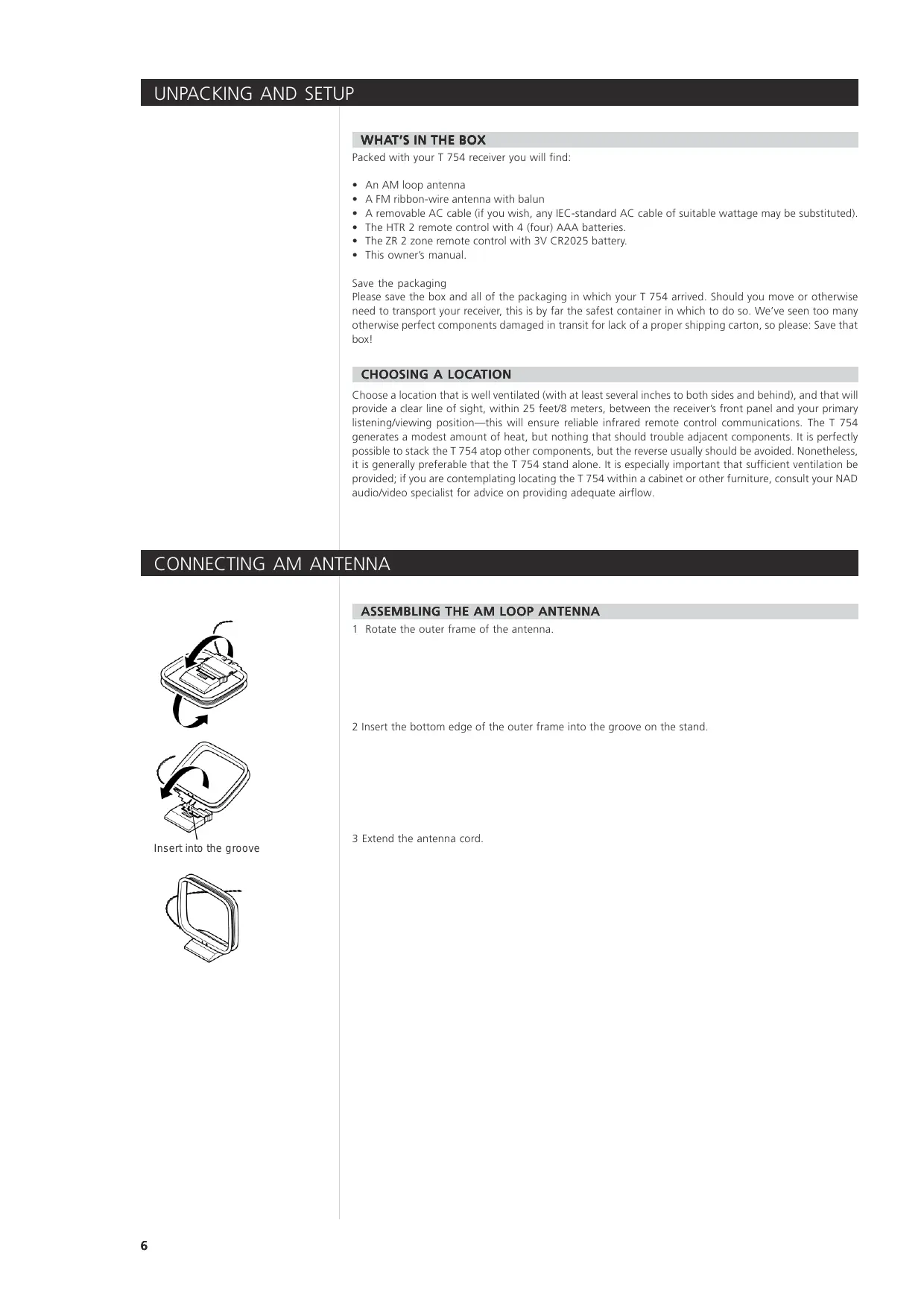 Packed with your T 754 receiver you will find An AM loop antenna A FM ribbon-wire antenna with balun A removable AC cable (if you wish, any IEC-standard AC cable of suitable wattage may be substituted). The HTR 2 remote control with 4 (four) AAA batteries. The ZR 2 zone remote control with 3V CR2025 battery. This owners manual Save the packaging Please save the box and all of the packaging in which your T 754 arrived. Should you move or otherwise need to transport your receiver, this is by far the safest container in which to do so. We‘ve seen too many otherwise perfect components damaged in transit for lack of a proper shipping carton, so please: Save that box!
