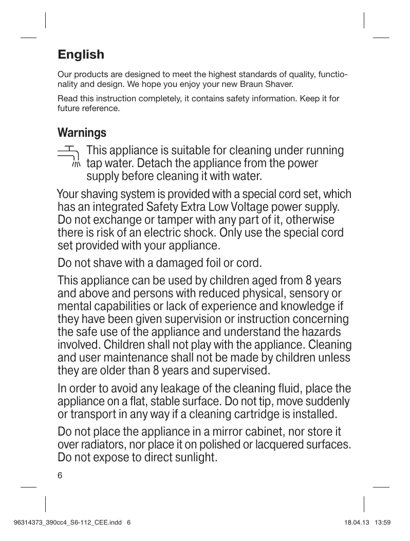 English Our products are designed to meet the highest standards of quality, functionality and design. We hope you enjoy your new Braun Shaver. Read this instruction completely, it contains safety information. Keep it for future reference. Warnings This appliance is suitable for cleaning under running tap water. Detach the appliance from the power supply before cleaning it with water. Your shaving system is provided with a special cord set, which has an integrated Safety Extra Low Voltage power supply. Do not exchange or tamper with any part of it, otherwise there is risk of an electric shock. Only use the special cord set provided with your appliance. Do not shave with a damaged foil or cord. This appliance can be used by children aged from 8 years and above and persons with reduced physical, sensory or mental capabilities or lack of experience and knowledge if they have been given supervision or instruction concerning the safe use of the appliance and understand the hazards involved. Children shall not play with the appliance. Cleaning and user maintenance shall not be made by children unless they are older than 8 years and supervised. In order to avoid any leakage of the cleaning fluid, place the appliance on a flat, stable surface. Do not tip, move suddenly or transport in any way if a cleaning cartridge is installed. Do not place the appliance in a mirror cabinet, nor store it over radiators, nor place it on polished or lacquered surfaces. Do not expose to direct sunlight.