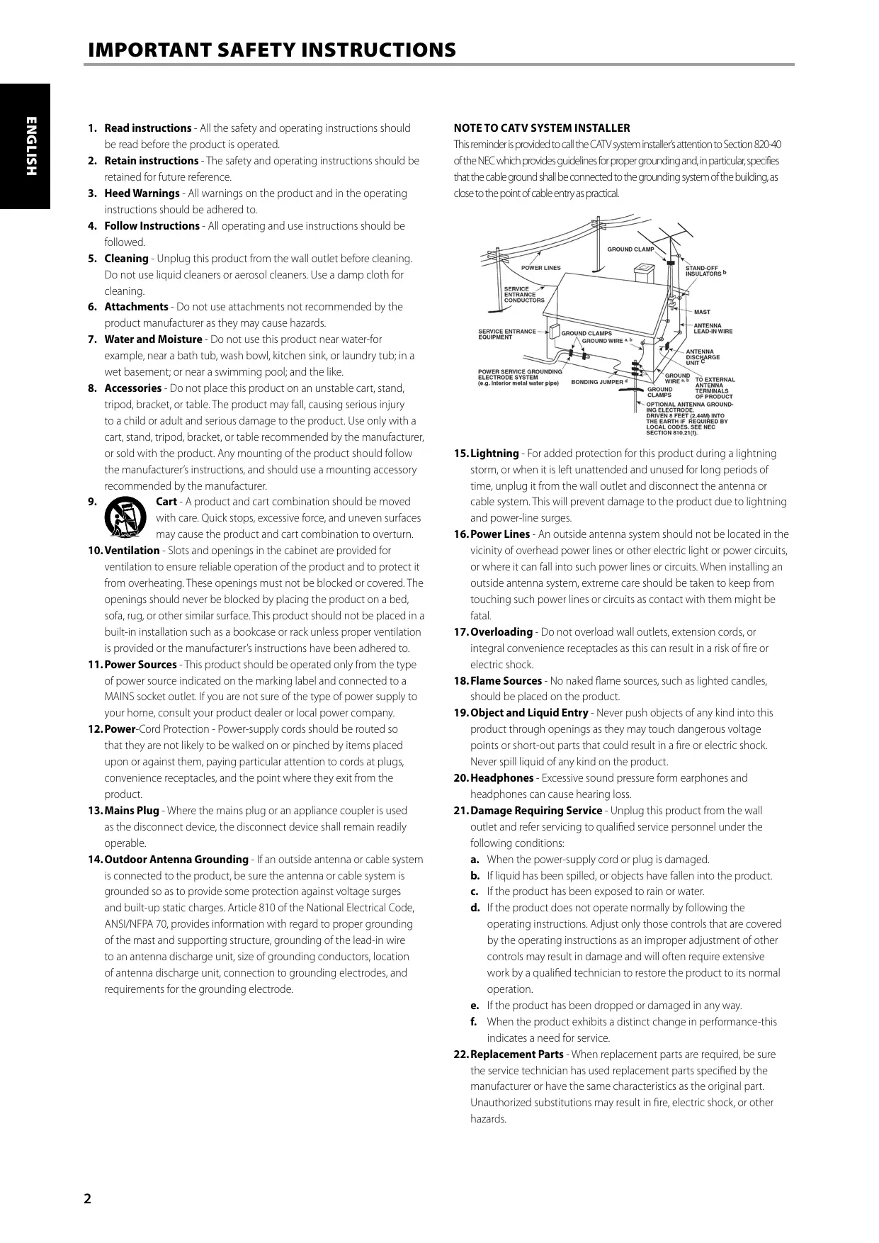 3. Tenez compte des Avertissements - Tous les Avertissements imprimés sur le produit et figurant dans les instructions d’utilisation doivent être respectés. 4. Suivez les instructions - Toutes les instructions d’utilisation et de fonctionnement doivent être suivies. 5. Nettoyage - Débranchez ce produit de la prise murale avant de procéder à son nettoyage. N’utilisez aucun nettoyant liquide ou aérosol. Servez-vous d’un chiffon humide pour effectuer le nettoyage. 6. Fixations - N’utilisez pas de fixations non recommandées par le fabricant car elles pourraient présenter des risques pour la sécurité. 7. Eau et humidité - N’utilisez pas ce produit près de l’eau, par exemple près d’une baignoire, d’un lavabo, d’un évier ou d’un bac à lessive. Ne l’utilisez pas non plus dans une cave humide, près d’une piscine ou dans un endroit semblable. 8. Accessoires - Ne mettez jamais cet appareil sur un chariot, un support, un trépied, une console ou une table instables. L’appareil risquerait de tomber, provoquant des blessures graves chez un enfant ou un adulte et pourrait lui-même subir de sérieux dommages. Utilisez exclusivement un chariot, un support, un trépied, une console ou une table préconisés par le fabricant ou vendus avec l’appareil. Toute fixation du produit doit être réalisée conformément aux instructions du fabricant, et à l’aide d’un accessoire de fixation préconisé par le fabricant. 9. Chariot - Lorsque l’appareil est sur un chariot mobile, il doit être déplacé avec précaution. Les arrêts brusques, les efforts excessifs et les sols accidentés risquent de renverser le chariot et l’appareil. 10. Ventilation - Le boîtier comporte des fentes et des ouvertures permettant l’aération et le fonctionnement fiable de l’appareil et l’empêchant de chauffer excessivement. Ces ouvertures ne doivent jamais être obstruées ou recouvertes. Les fentes ne doivent jamais être obstruées en posant l’appareil sur un lit, un canapé, un tapis ou toute autre surface molle similaire. Ce produit ne doit pas être placé dans un ensemble encastré, comme par exemple une bibliothèque vitrée ou un rack, à moins de prévoir une ventilation adéquate ou de respecter les instructions du fabricant. 11. Sources d’alimentation - Ce produit doit obligatoirement être alimenté par une source du type indiqué sur l’étiquette et connecté à une prise de terre SECTEUR. Si vous avez un doute concernant le type d’alimentation secteur utilisé à votre domicile, consultez votre revendeur ou le fournisseur local d’électricité. 12. Protection du câble d’alimentation - Les câbles d’alimentation ne doivent pas passer dans des endroits où ils risquent d’être piétinés ou pincés par des articles posés dessus ou à côté. Faites particulièrement attention aux câbles au niveau des prises, des connecteurs de commodité à l’arrière d’autres appareils, et à leur point de sortie de cet appareil. 13. Prise Secteur - Si une prise secteur ou coupleur d’appareils est utilisé(e) comme dispositif de débranchement, ce dispositif de débranchement doit être facilement accessible. 14. Mise à la terre d’une Antenne Extérieure - Si l’appareil est relié à une antenne extérieure ou à un réseau de câbles extérieurs, veillez à ce que l’antenne ou le réseau de câbles soit mis à la terre afin d’assurer la même protection contre les pics de tension et les charges liées à l’accumulation d’électricité statique. L’Article 810 du National Electrical Code (NEC), ANSI/NFPA 70, contient des informations concernant la mise à la terre correcte du mât et de la structure porteuse, la mise à la terre du câble d’amenée sur un dispositif de décharge d’antenne, le calibre des câbles de mise à la terre, l’emplacement du dispositif de décharge d’antenne, le branchement aux électrodes de mise à la terre et les exigences concernant les électrodes de mise à la terre.