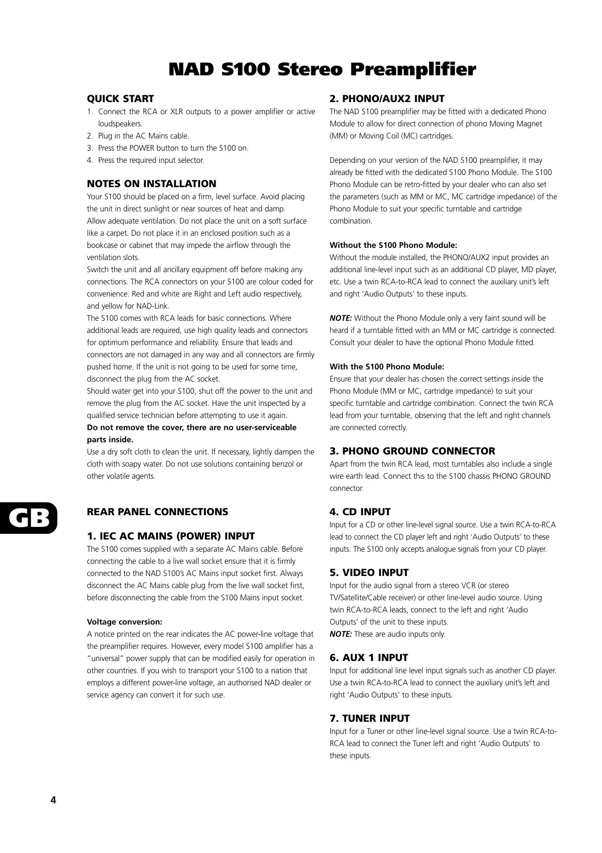 Download the instructions for your in PDF format for free! Find your manual -S100 - NAD and take your electronic device back in hand. On this page are published all the documents necessary for the use of your device. -S100 by NAD.