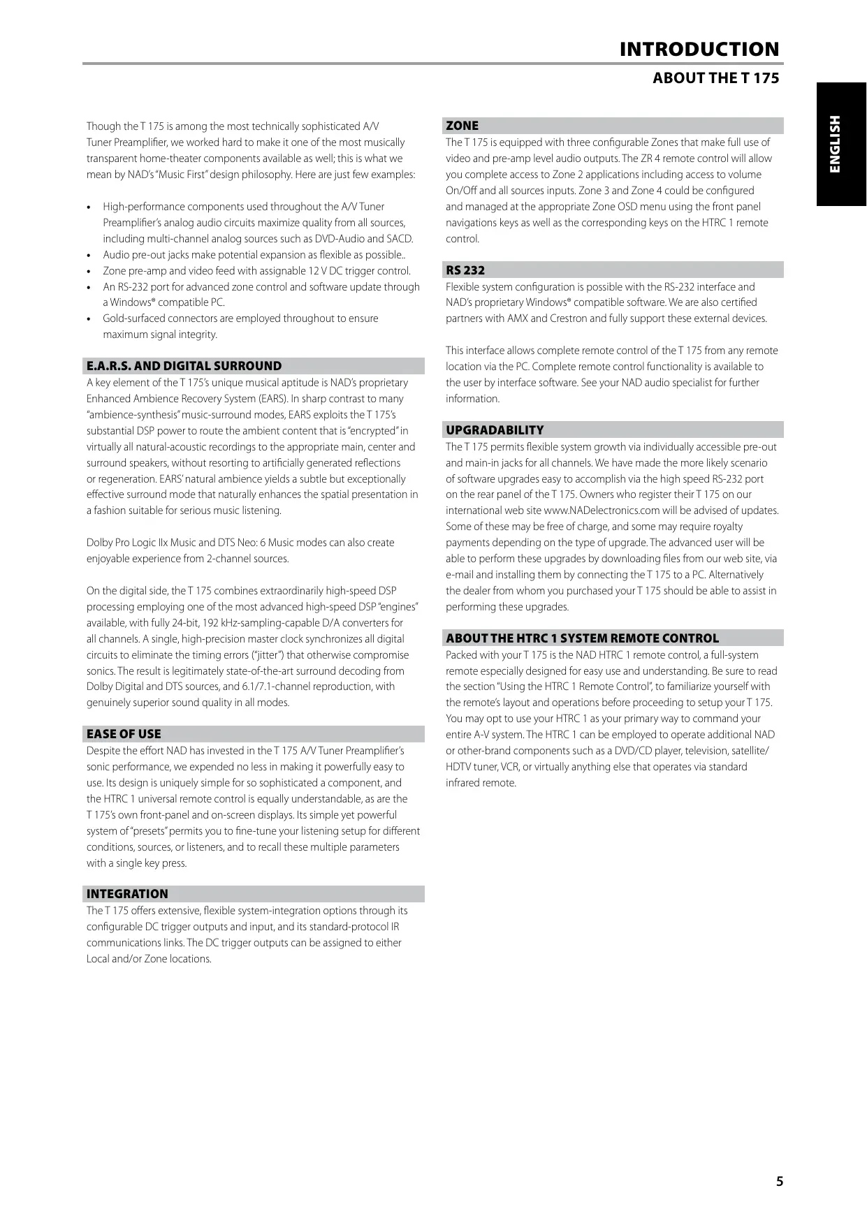 Despite the effort NAD has invested in theT 175 AW Tuner Preamplifiers sonic performance, we expended no less in making it powerfully easy to use. ts design is uniquely simple for so sophisticated a component, and the HTRC 1 universal remote control is equally understandable, as are the T 1755 own front-panel and on-screen displays. ts simple yet powerful system of‘presets” permits you to fine-tune your listening setup for different conditions, sources, or listeners, and to recall these multiple parameters with a single key press. INTEGRATION The T 175 offers extensive, flexible systemrintegration options through its configurable DC trigger outputs and input, and its standard-protocol IR communications links. The DC trigger outputs can be assigned to either Local and/or Zone locations. ABOUT THET 175 ZONE TheT 175 is equipped with three configurable Zones that make full use of video and pre-amp level audio outputs. The ZR 4 remote control wil allow you complete access to Zone 2 applications including access to volume On/Off and al sources inputs. Zone 3 and Zone 4 could be configured and managed at the appropriate Zone OSD menu using the front panel navigations keys as well as the corresponding keys on the HTRC 1 remote control RS 232 Flexible system configuration is possible with the RS-232 interface and NAD$ proprietary Windows® compatible software.We are also certified partners with AMX and Crestron and fully support these external devices. This interface allows complete remote control of the T 175 from any remote location via the PC. Complete remote control functionality is available to the user by interface software. See your NAD audio specialist for further information. UPGRADABILITY TheT 175 permits flexible system growth via individually accessible pre-out and main-in jacks for all channels. We have made the more likely scenario of software upgrades easy to accomplish via the high speed RS-232 port on the rear panel of the T 175. Owners who register their T 175 on our international web site wwmwNADelectronics.com will be advised of updates. Some of these may be free of charge, and some may require royalty payments depending on the type of upgrade. The advanced user will be able to perform these upgrades by downloading files from our web site, via e-mail and instaling them by connecting the T 175 to a PC. Alternatively the dealer from whom you purchased your 175 should be able to assist in performing these upgrades