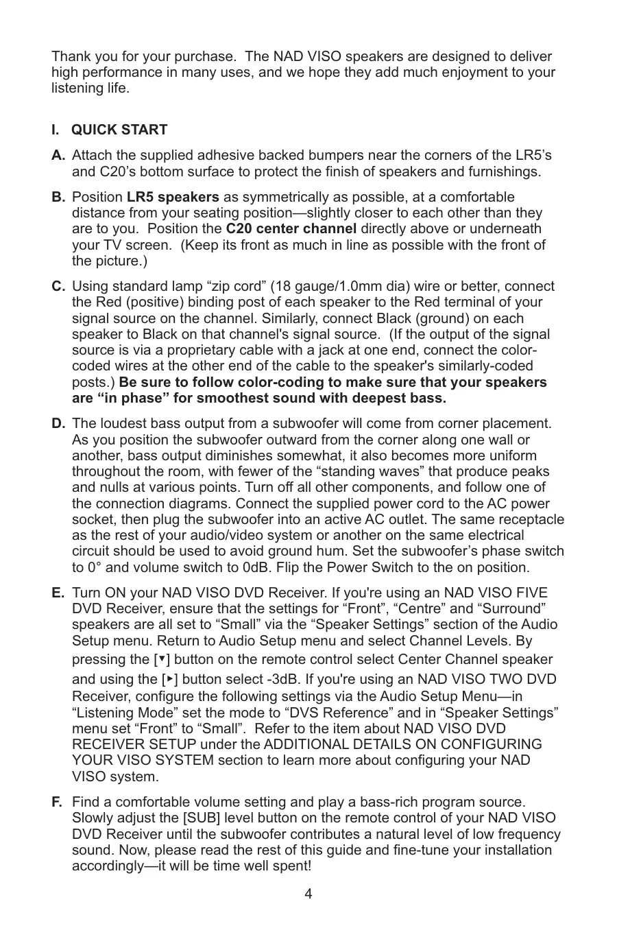 E. Turn ON your NAD VISO DVD Receiver. If you're using an NAD VISO FIVE DVD Receiver, ensure that the settings for "Front", "Centre" and "Surround" speakers are all set to "Small" via the "Speaker Settings" section of the Audio Setup menu. Return to Audio Setup menu and select Channel Levels. By pressing the [▼] button on the remote control select Center Channel speaker and using the [▶] button select -3dB. If you're using an NAD VISO TWO DVD Receiver, configure the following settings via the Audio Setup Menu—in "Listening Mode" set the mode to "DVS Reference" and in "Speaker Settings" menu set "Front" to "Small". Refer to the item about NAD VISO DVD RECEIVER SETUP under the ADDITIONAL DETAILS ON CONFIGURING YOUR VISO SYSTEM section to learn more about configuring your NAD VISO system.