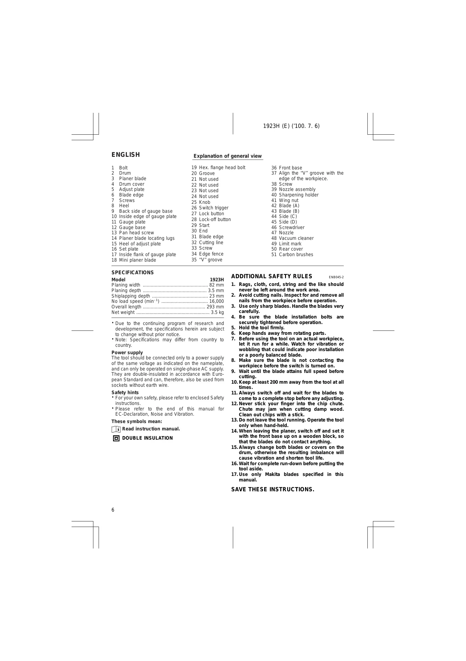 1923H Planing width 82 mm Planing depth 3.5 mm Shiplapping depth 23 mm No load speed (min–1) 16,000 Overall length 293 mm Net weight 3.5 kg • Due to the continuing program of research and development, the specifications herein are subject to change without prior notice. • Note: Specifications may differ from country to country. Power supply The tool should be connected only to a power supply of the same voltage as indicated on the nameplate, and can only be operated on single-phase AC supply. They are double-insulated in accordance with European Standard and can, therefore, also be used from sockets without earth wire. Safety hints • For your own safety, please refer to enclosed Safety instructions. • Please refer to the end of this manual for EC-Declaration, Noise and Vibration. These symbols mean: Read instruction manual. DOUBLE INSULATION